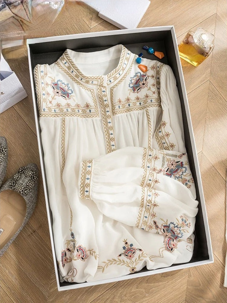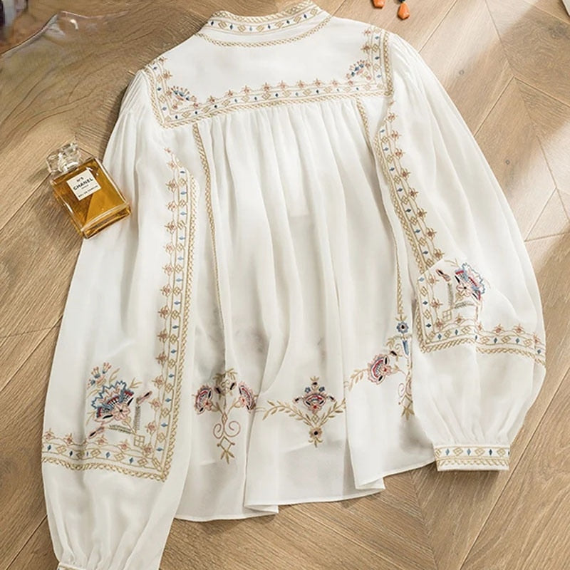 Lace Embroidery White Women Shirts Summer New O-Neck Long-Sleeved Loose Elegant Office Lady Outwear Tops