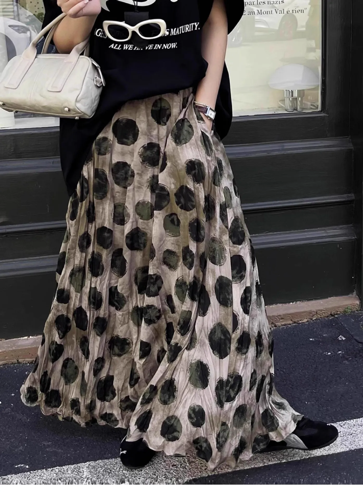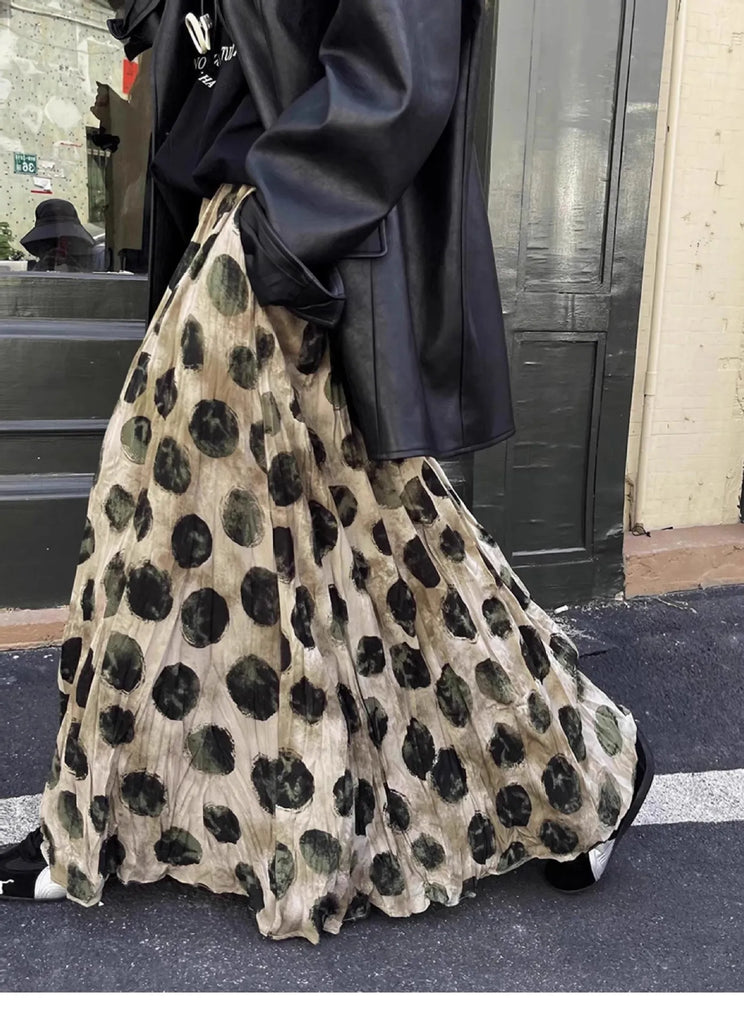 Large Polka Dot Print Pleat Long Skirt Elastic Waist Fashion Sprint Women Skirt A-line Loose Streetwear Summer Skirt 2025 New