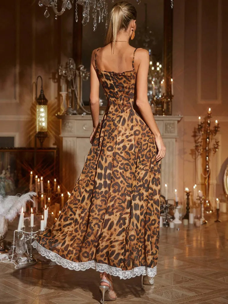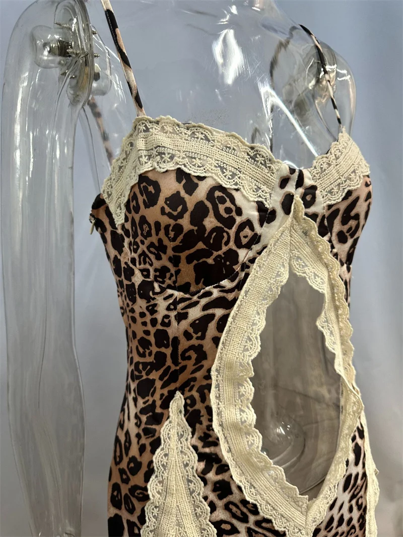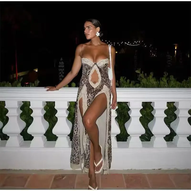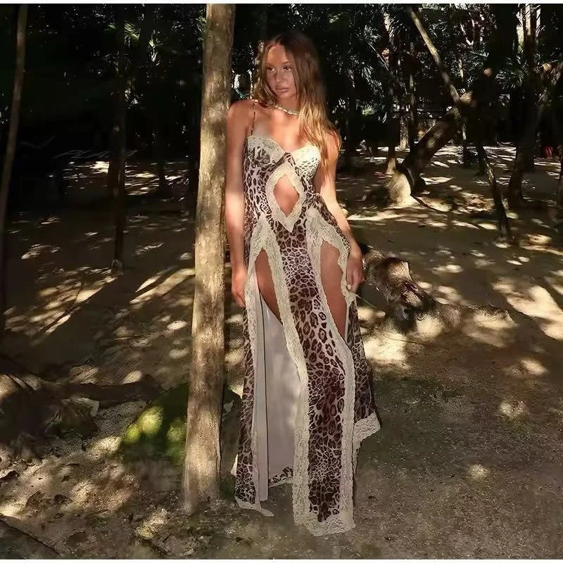 Leopard Print Beach Sexy Maxi Dress Women Gown Summer Patchwork Hollow Out Off-shoulder Split Club Long Dress Elegant