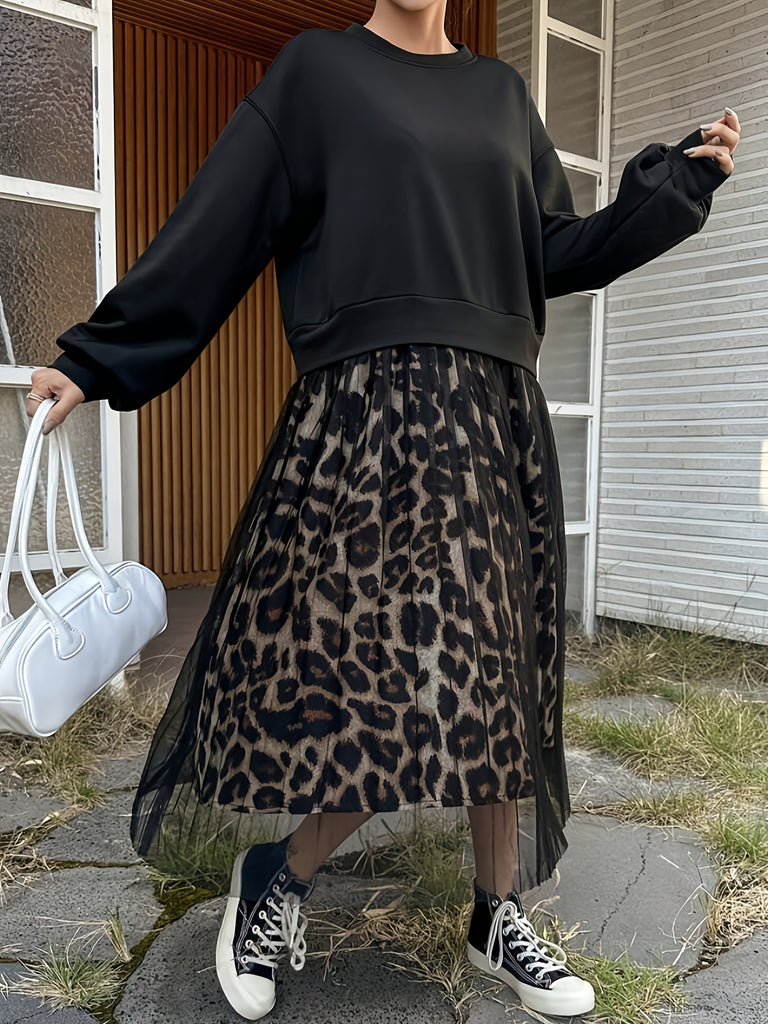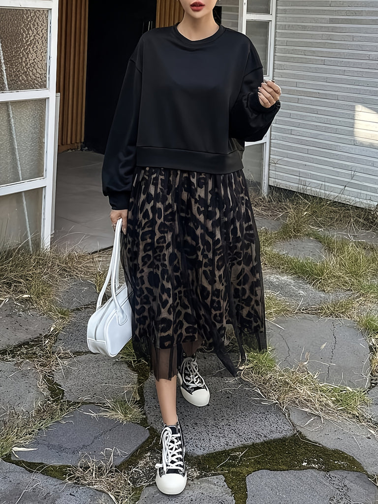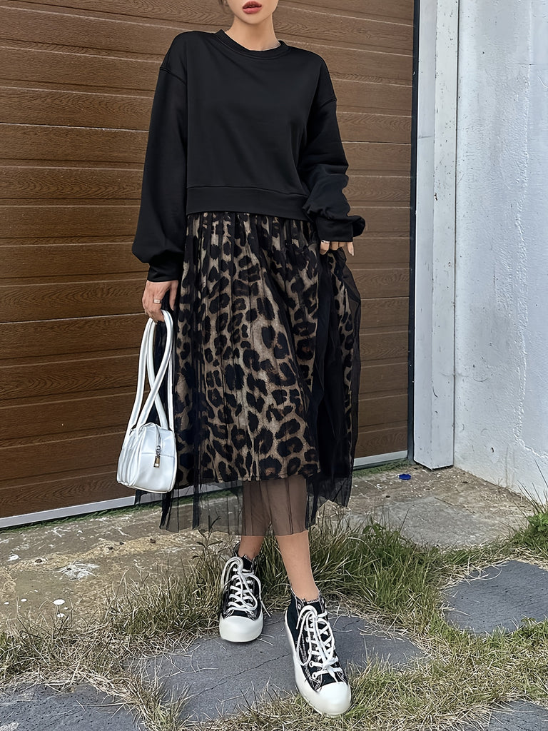 [Leopard Print Crew Neck Dress] Leopard Print Crew Neck Dress, Elegant Long Sleeve Mesh Stitching A-line Dress for Spring & Fall, Women's Clothing