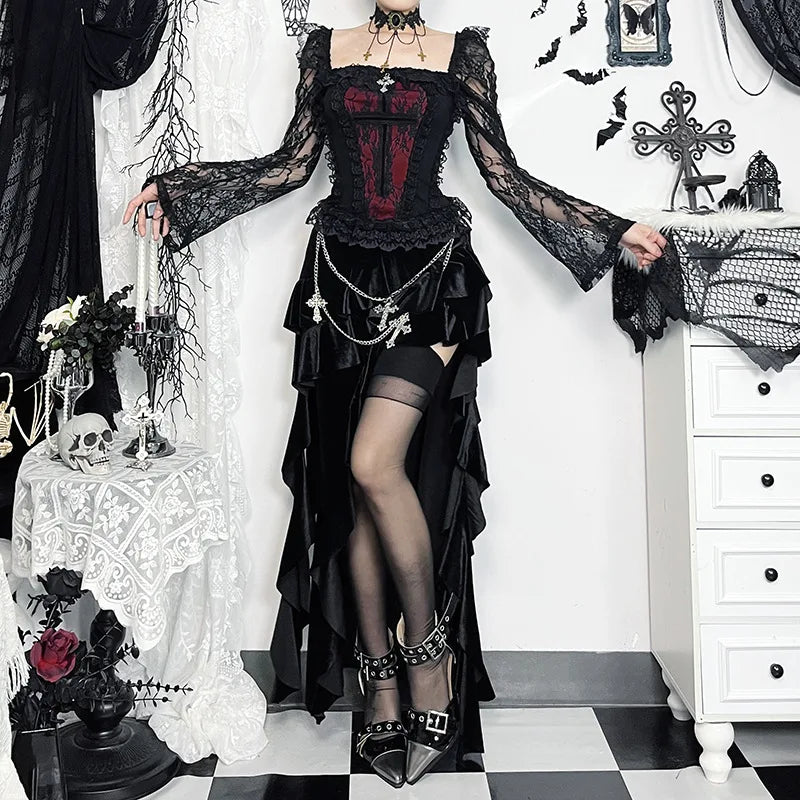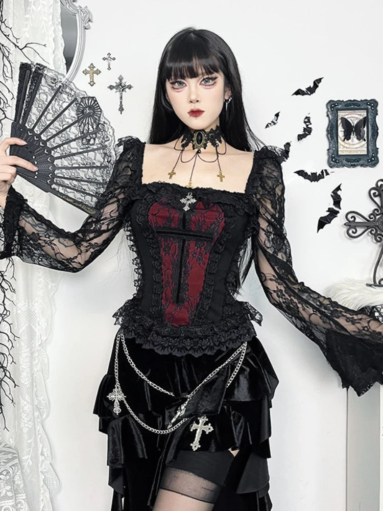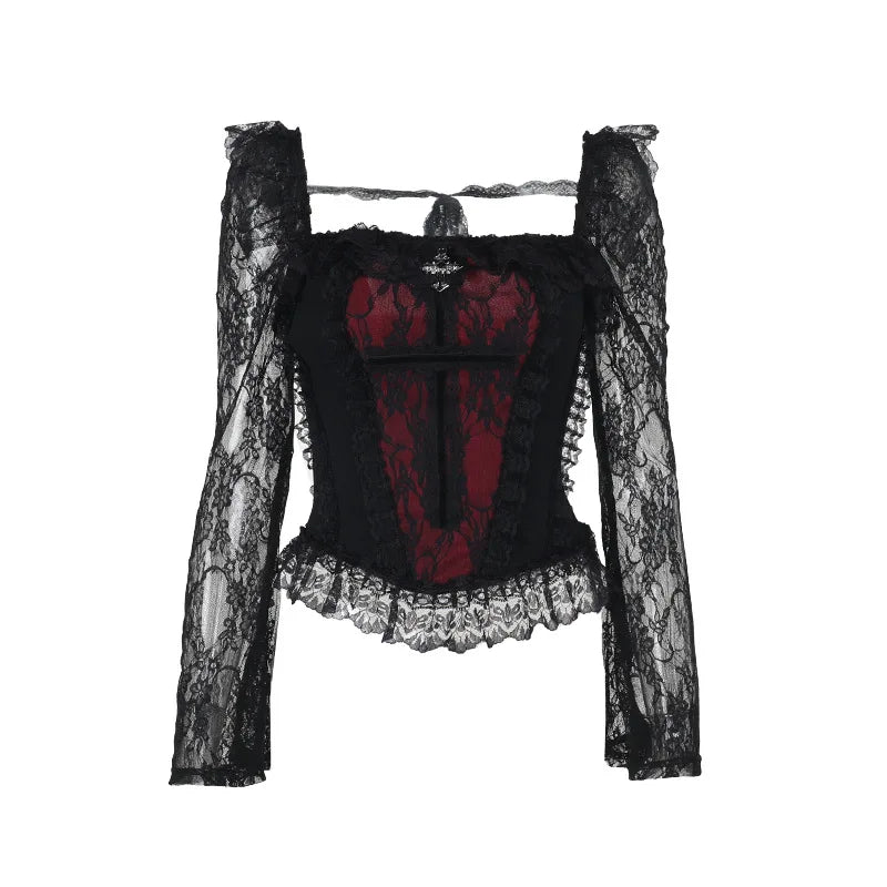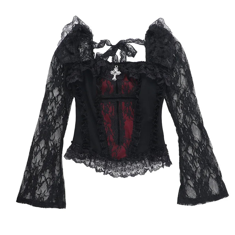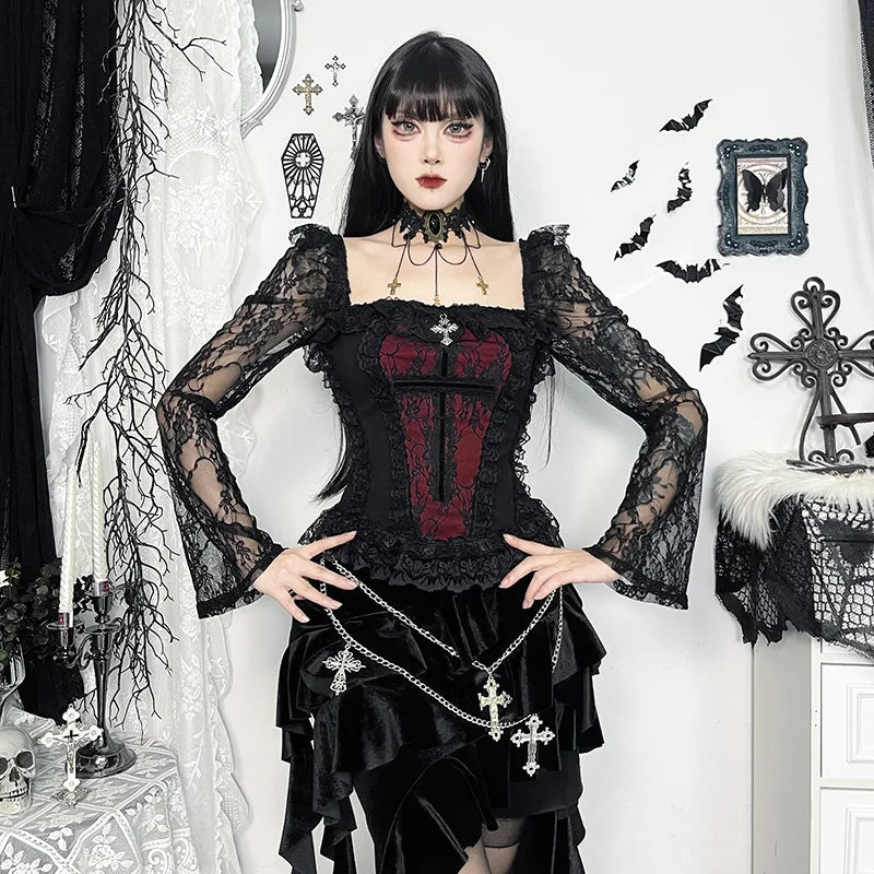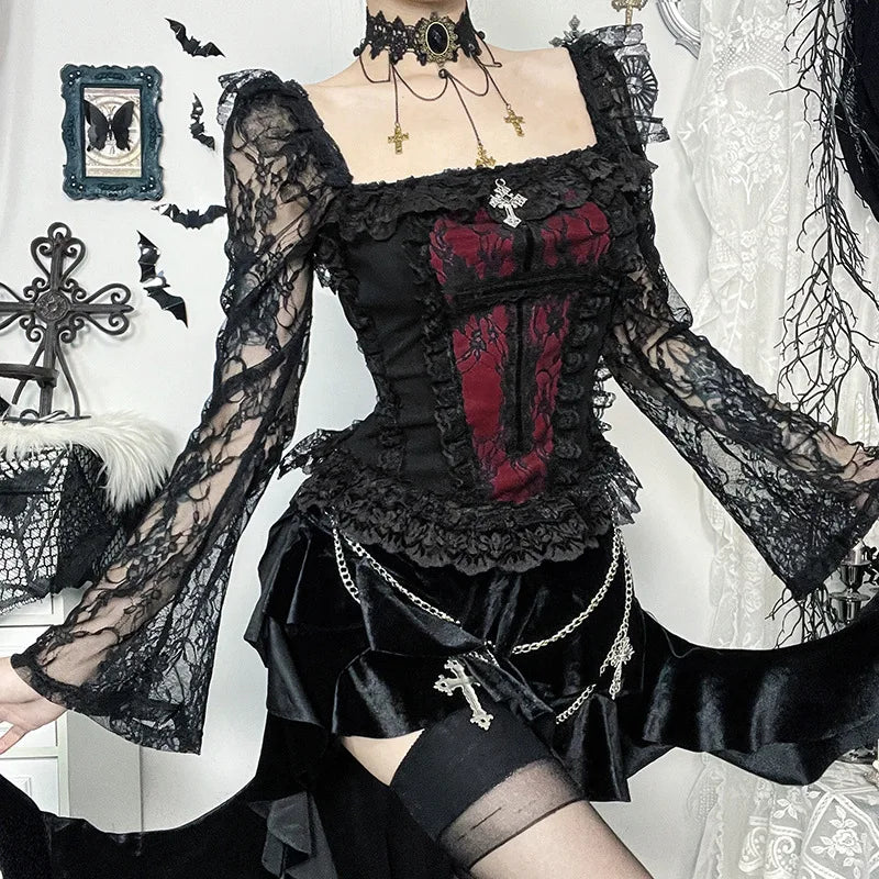 Mall Gothic Vintage Lace T-shirt Women Palace Style Sexy Cross Lace Patchwork Square Collar Flare Sleeve Crop Tee Tops