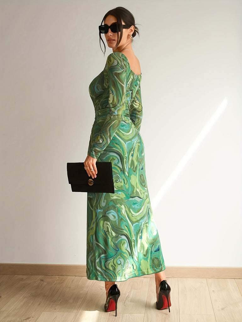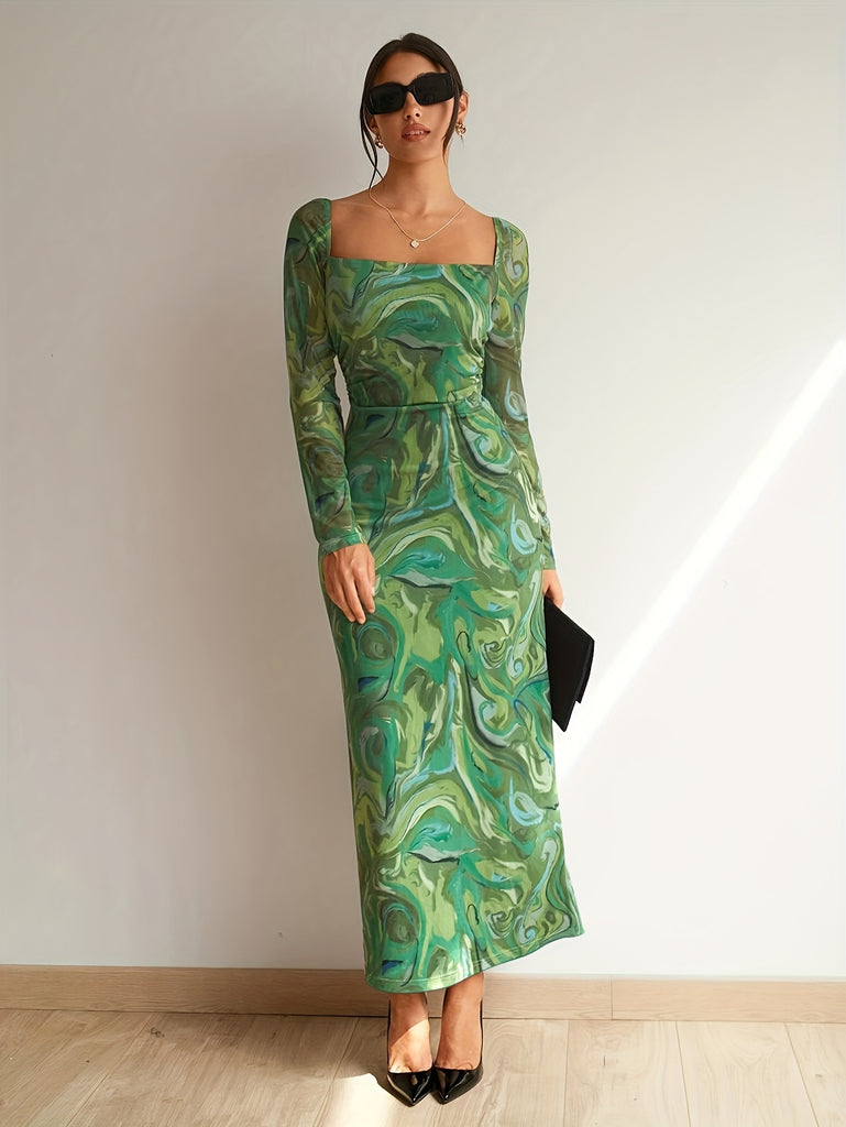 Marble Print Long Sleeve Dress, Stylish Square Neck Ankle Length Dress For Spring & Fall, Women's Clothing