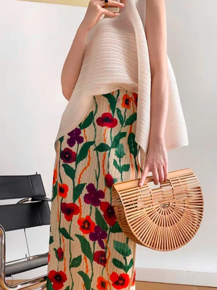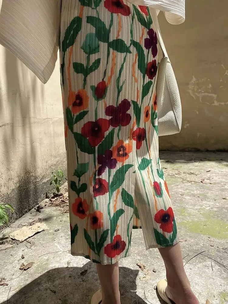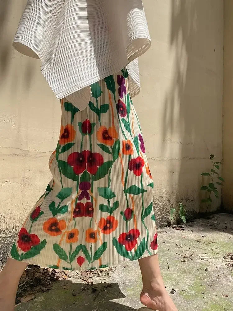 Midi Print Skirts Women Vintage Summer Holiday Back-slit Mujer Aesthetic Prairie Style Office Lady Ins Temperament Casual Daily