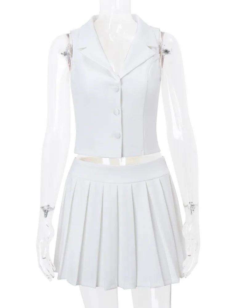 Fashion Pleated Skirt Two Piece Set For Women V Neck Sleeveless Tops And Pleated Mini Skirt Femme Elegant Skirt Setsn
