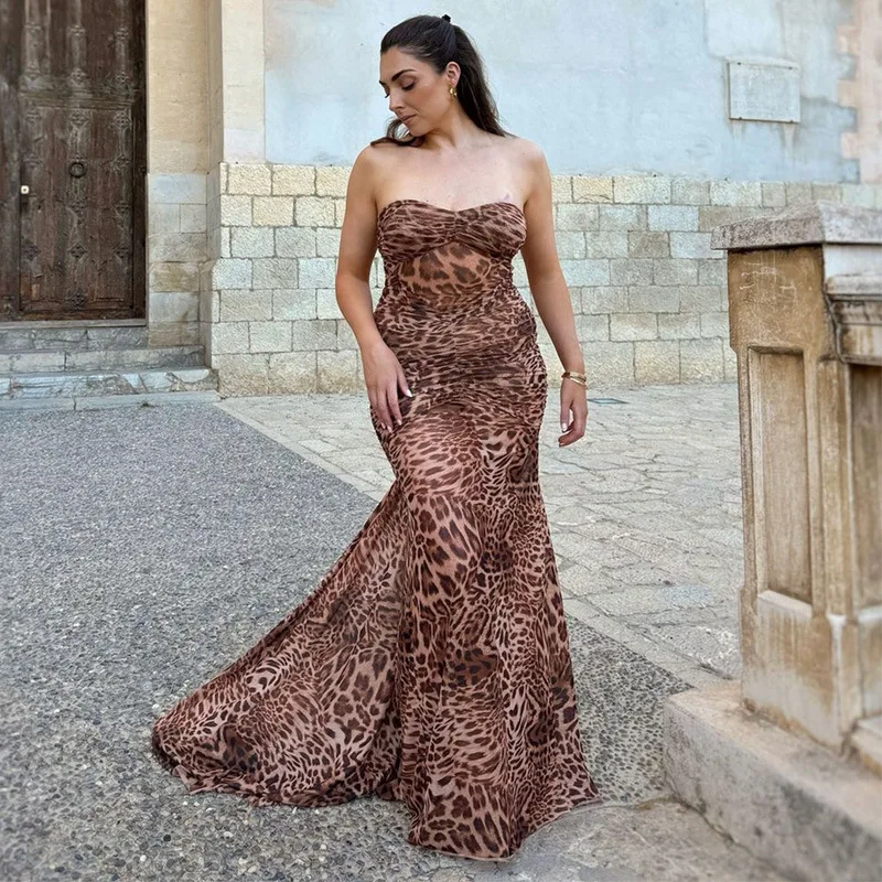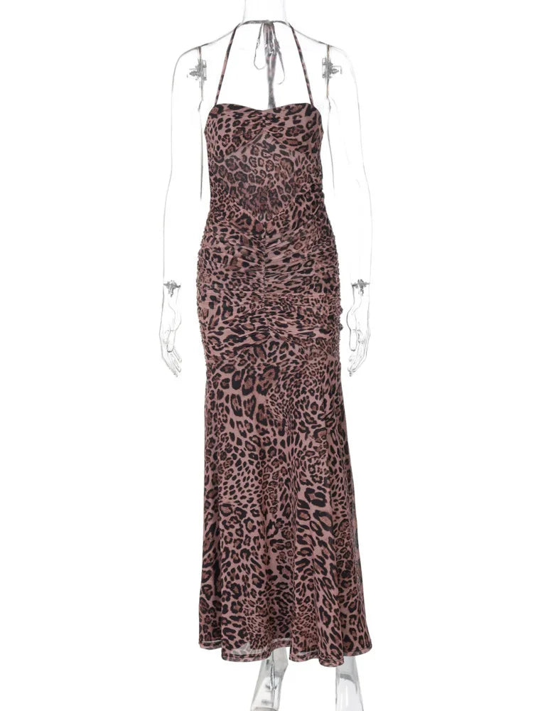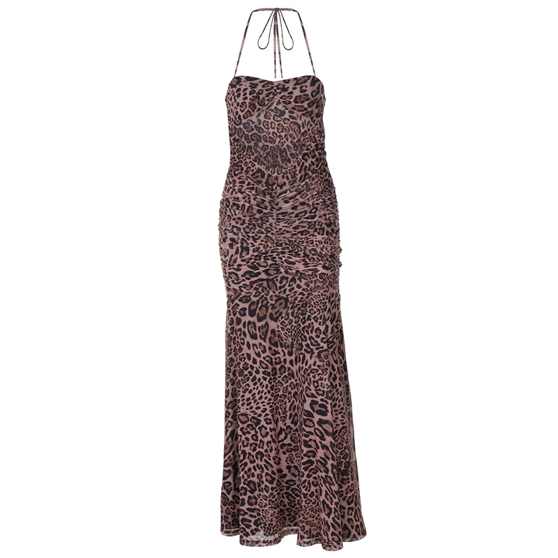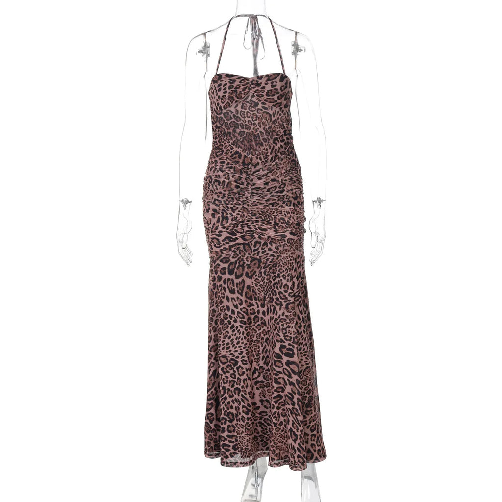 Leopard Print Backless Sexy Maxi Dress For Women Gown Halter Off-shoulder Sleeveless Bodycon Beach Long Dress Vestido