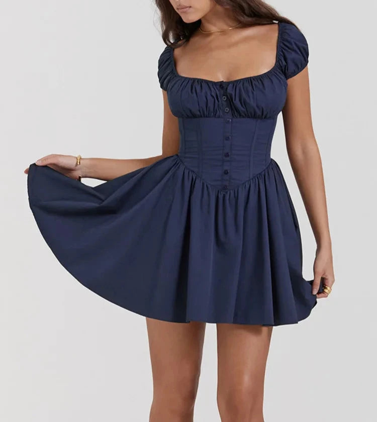 Square Collar Pleated Mini Dress For Women Navy Blue Fashion Short Sleeve Backless A-line Club Party Sexy Dress Elegant