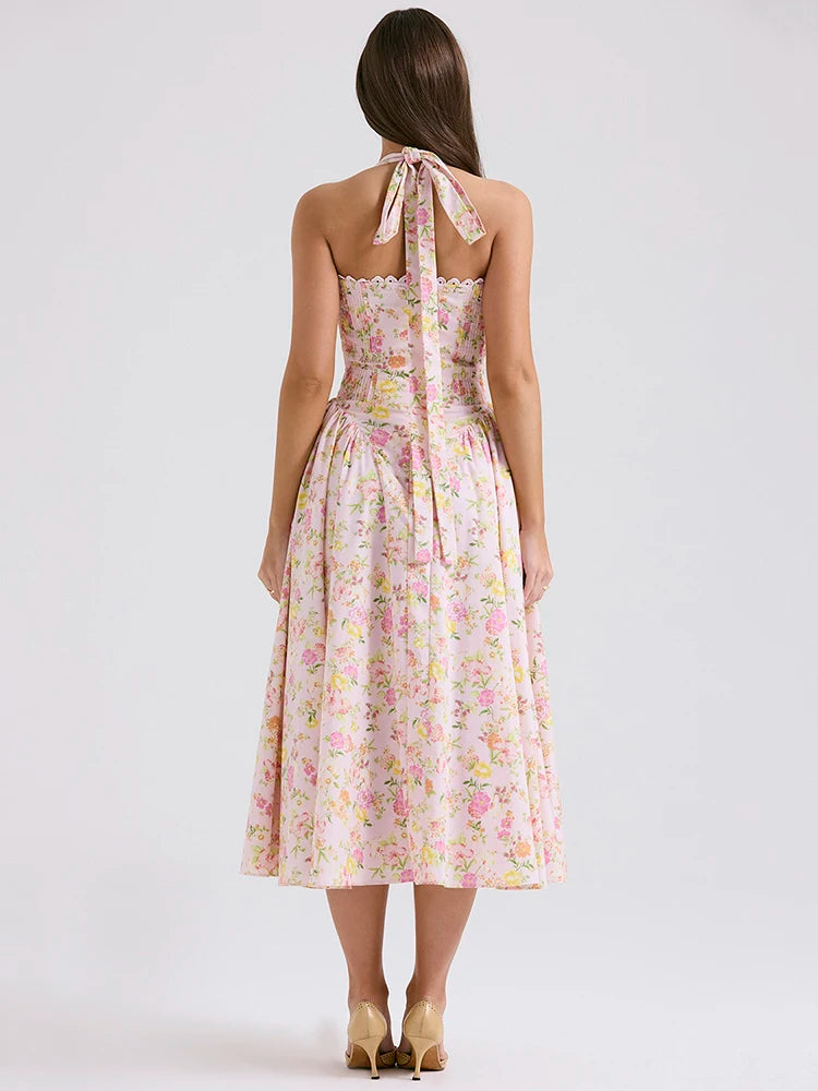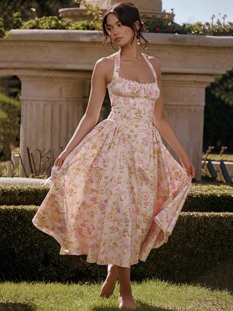 Vintage Print Midi Sundress For Women Summer New Fashion Halter Sleeveless Backless A-line Sexy Long Dress