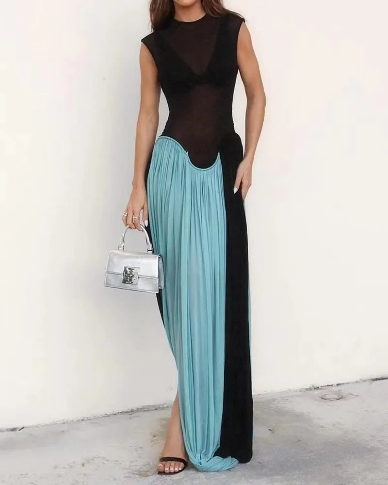 Pbong Black Mesh Sheer Patchwork Blue Long Luxury Dress For Summer Women Vacation Clothing Vestidos Elegantes Para Mujeres