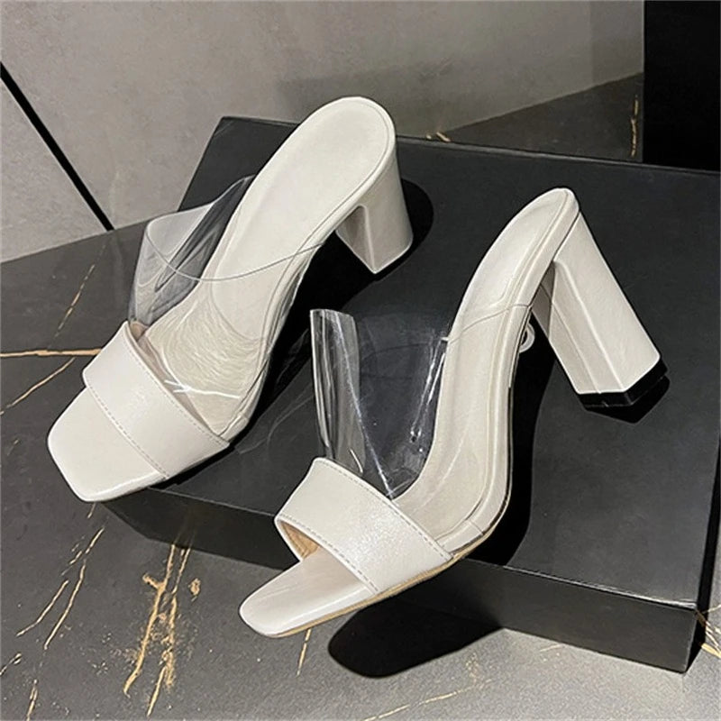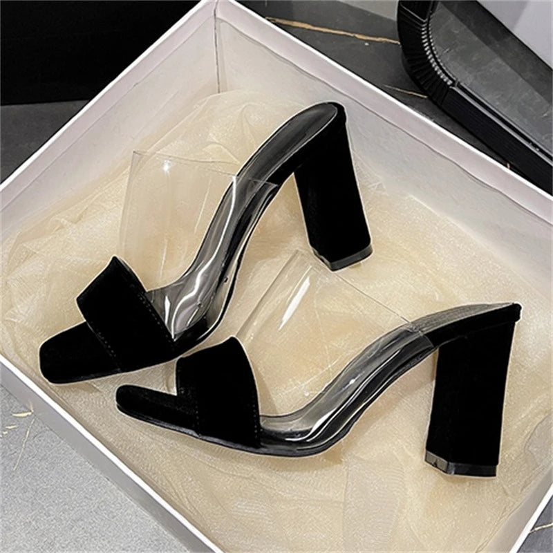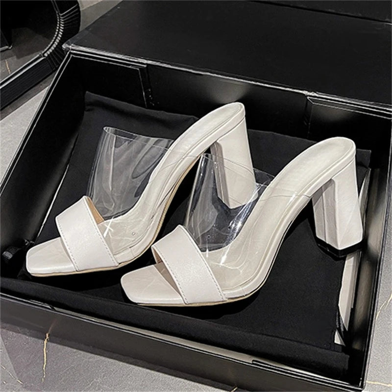 Pbong Fashion Design Splicing PVC Transparent Open Toe Women Slippers Summer Square High Heels Party Slide Shoes