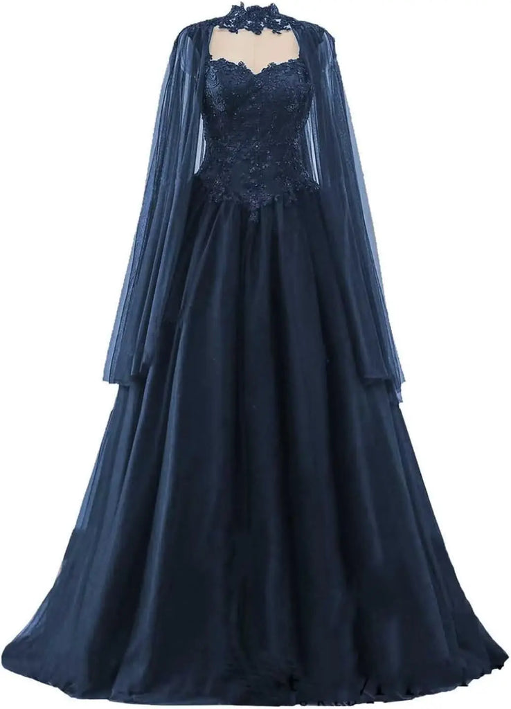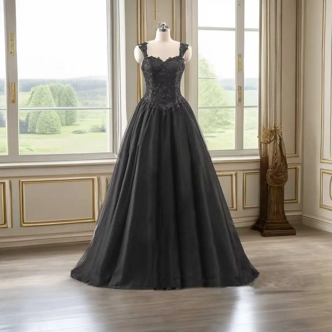 Pbong Gothic Black Wedding Dresses for Bride Lace Appliques Bridal Gowns Tulle Wedding Gowns