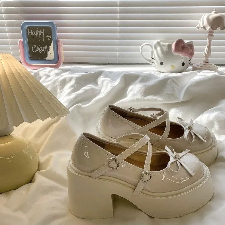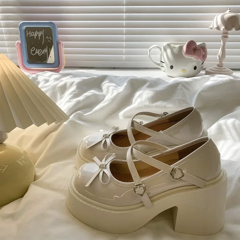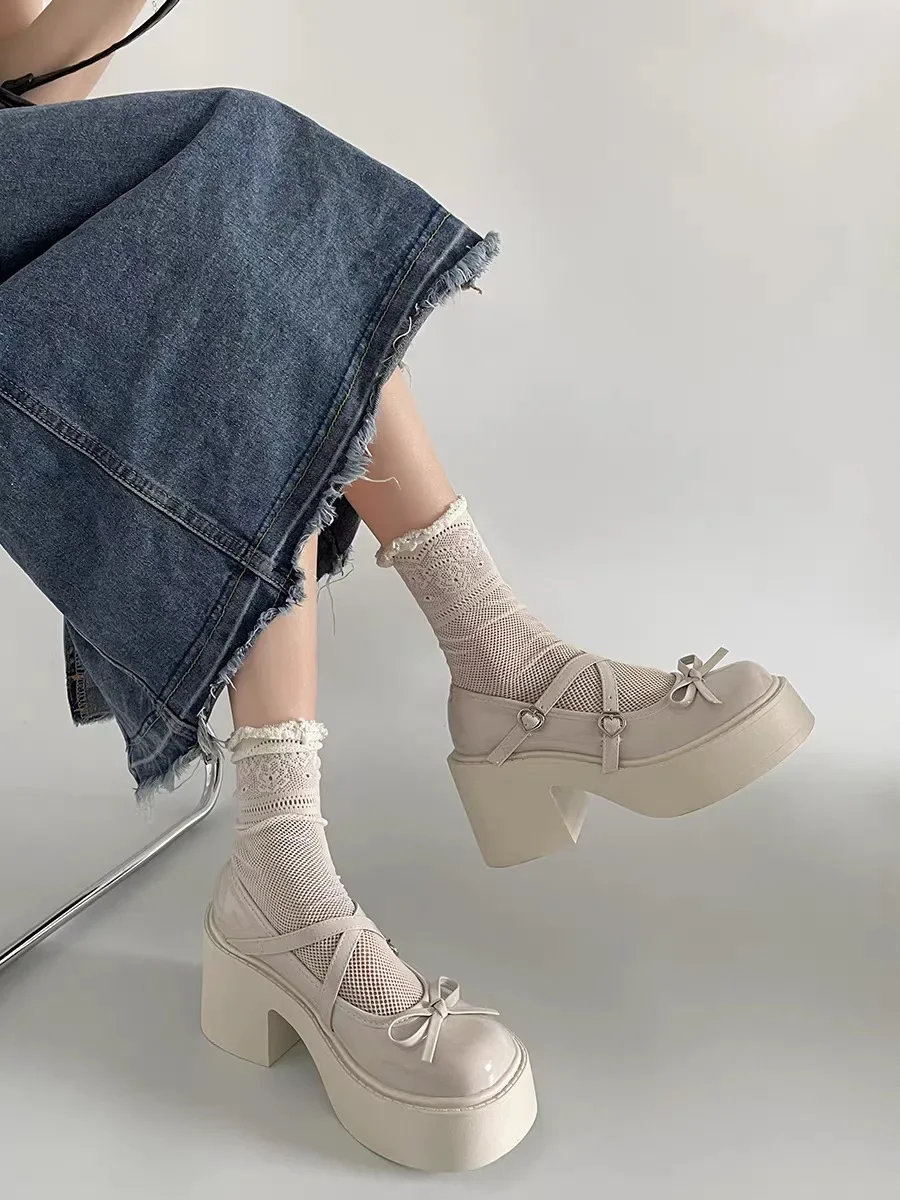 Pbong Knot High Heel Mary Jane Single Shoes Women's Summer New Japanese Style JK Heightening French Leather Shoes Women