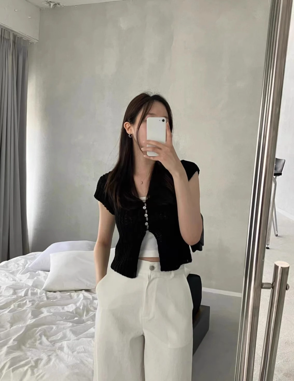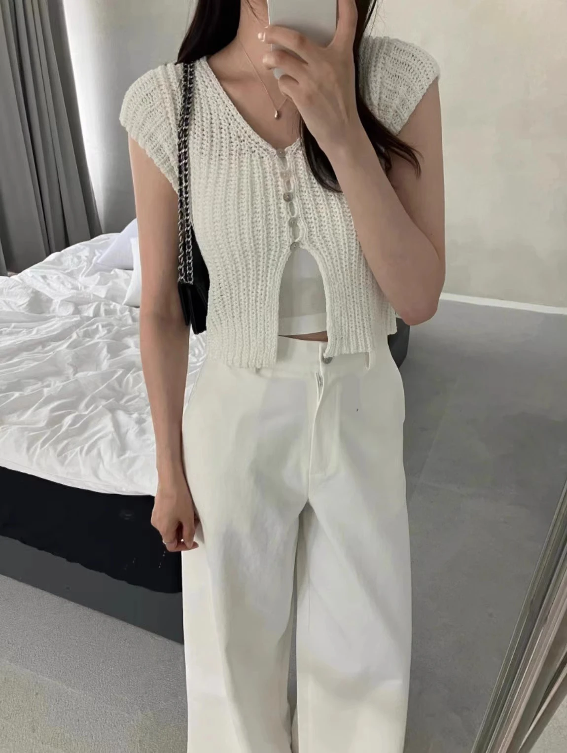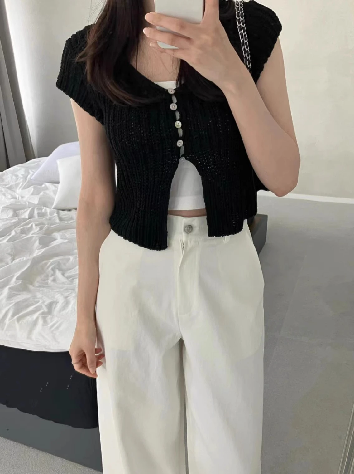 Pbong Korean Cropped Cardigan Women Clothing Short Sleeve V-neck Solid Top Fashion Single Breasted Split Knitting Sweater