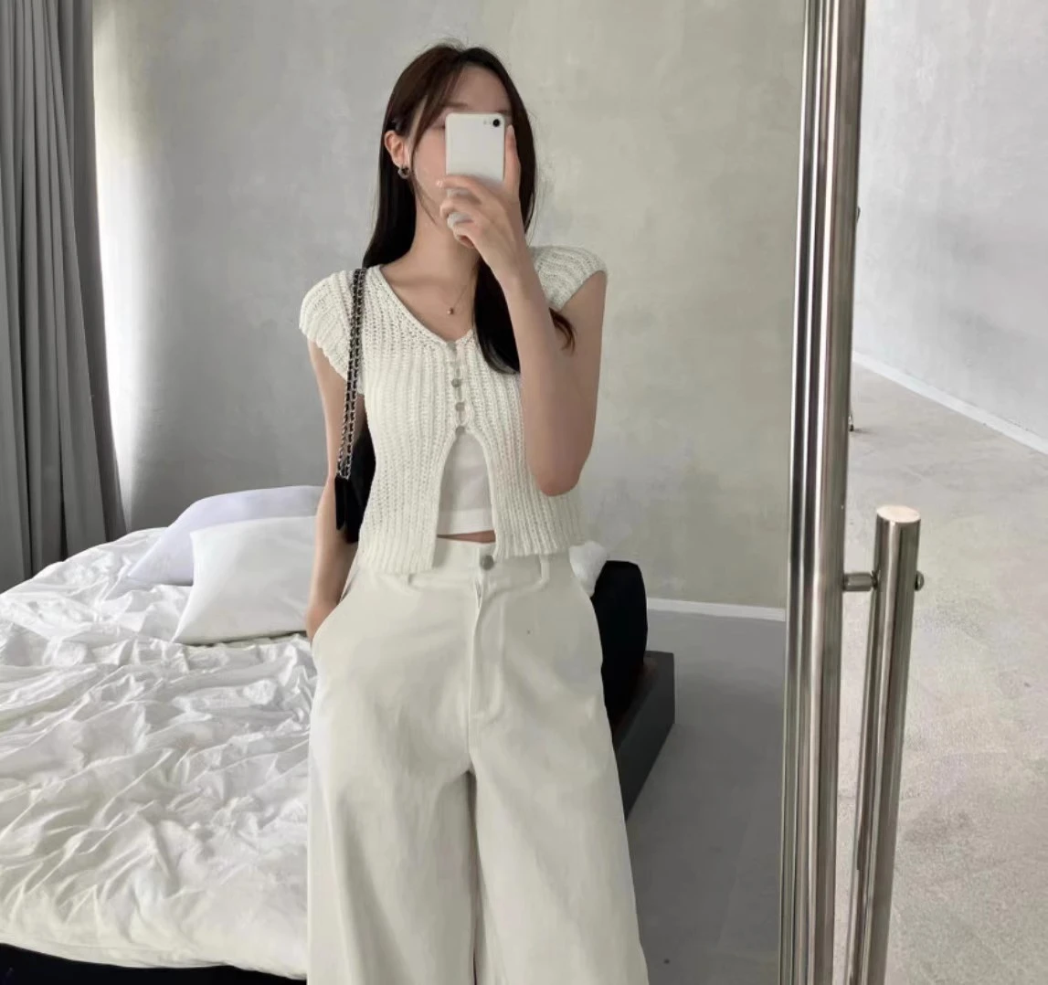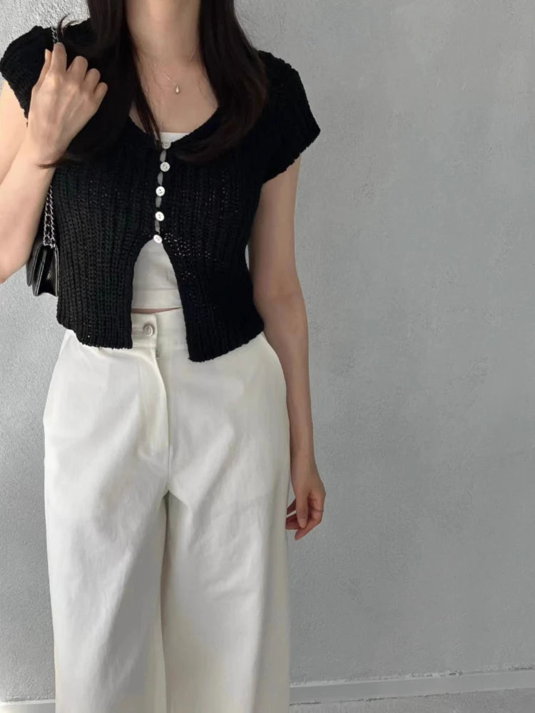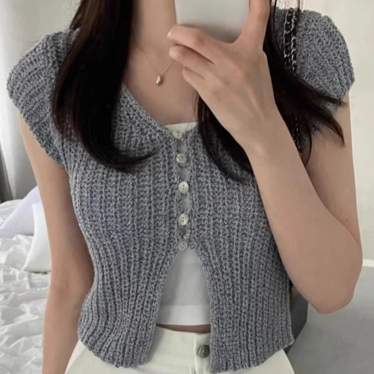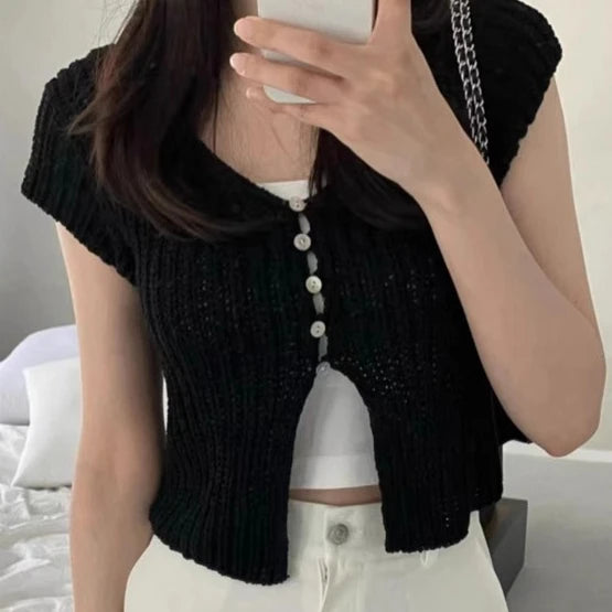 Pbong  Korean  Cropped Cardigan Women Clothing Short Sleeve V-neck Solid Top Fashion Single Breasted Split Knitting Sweater