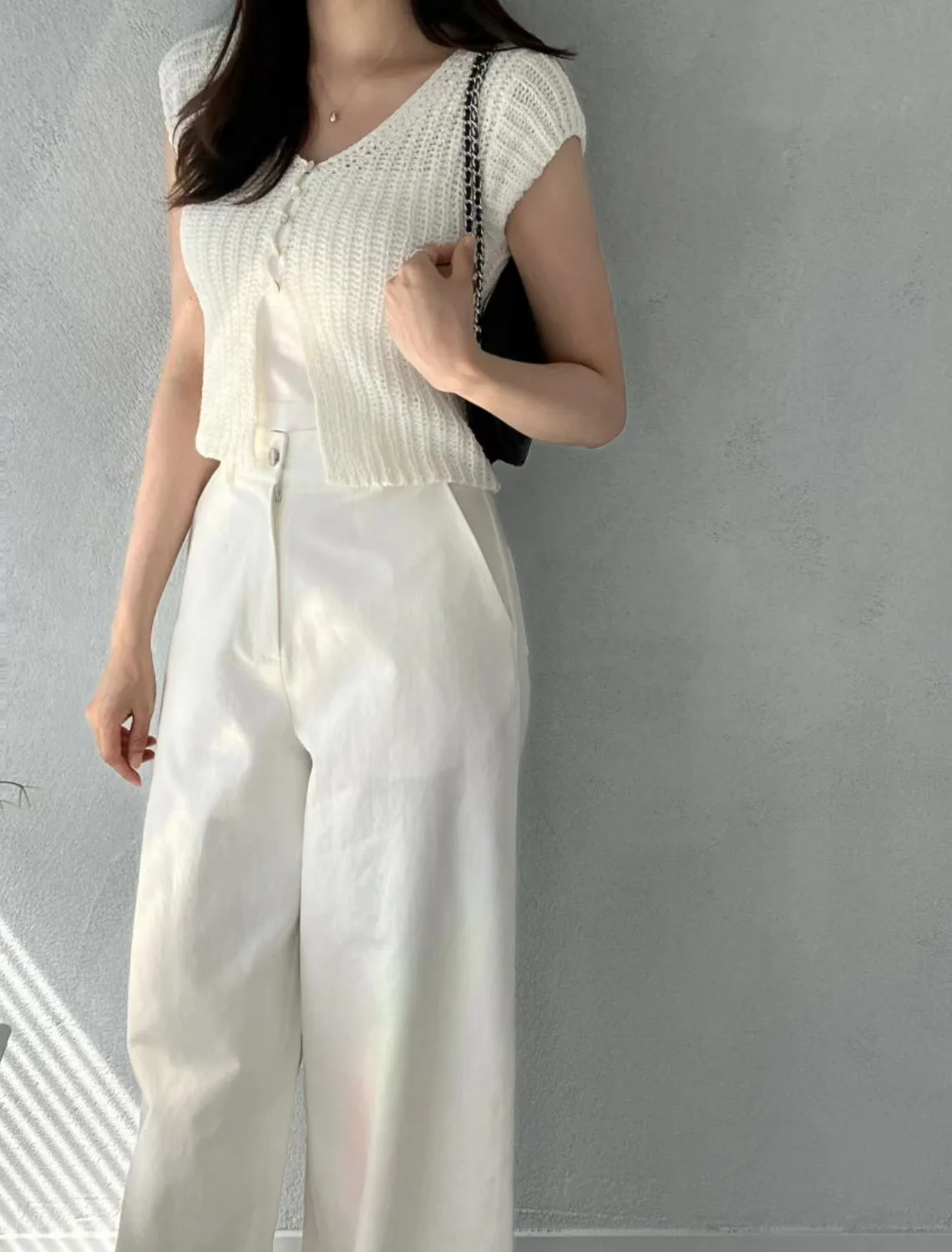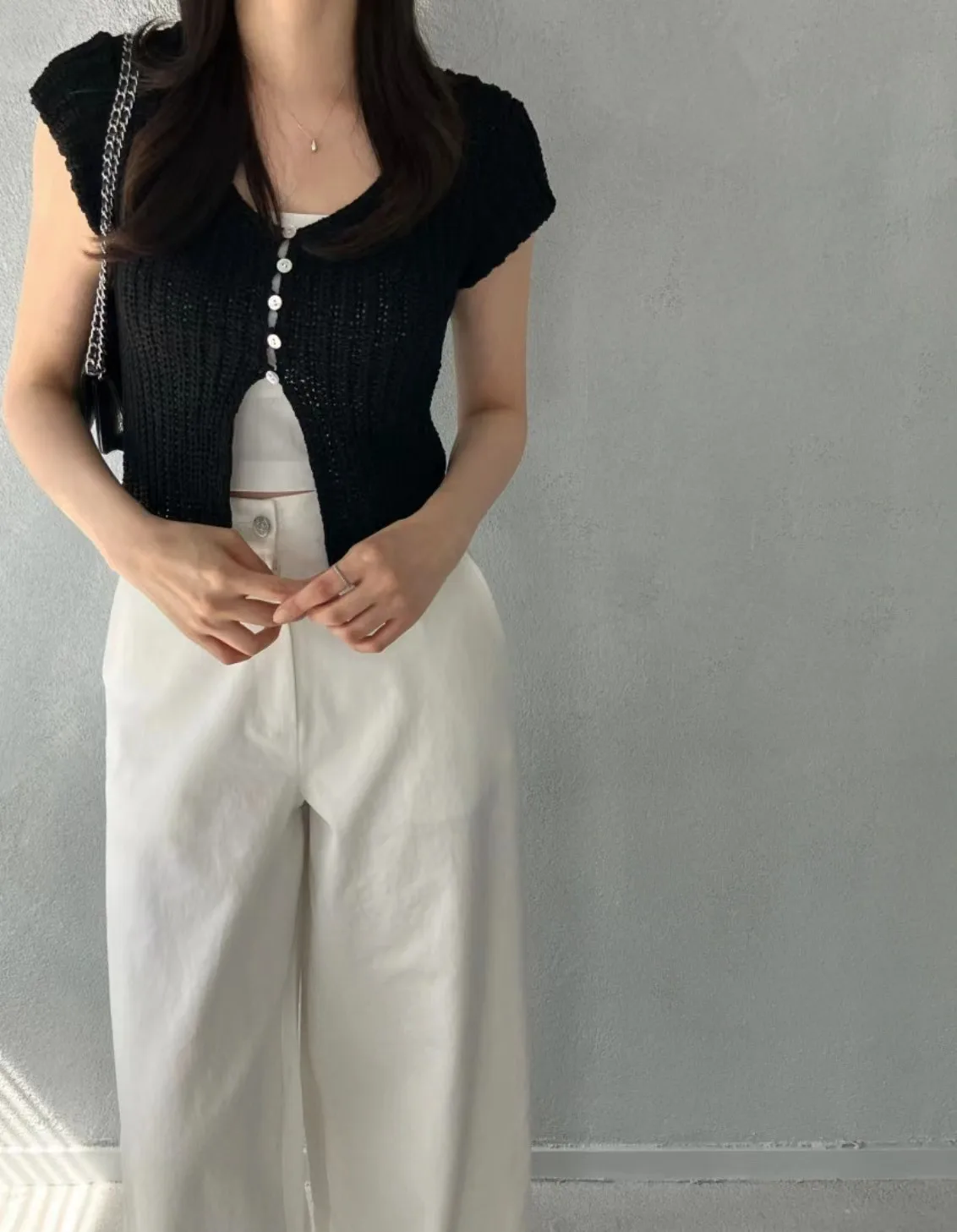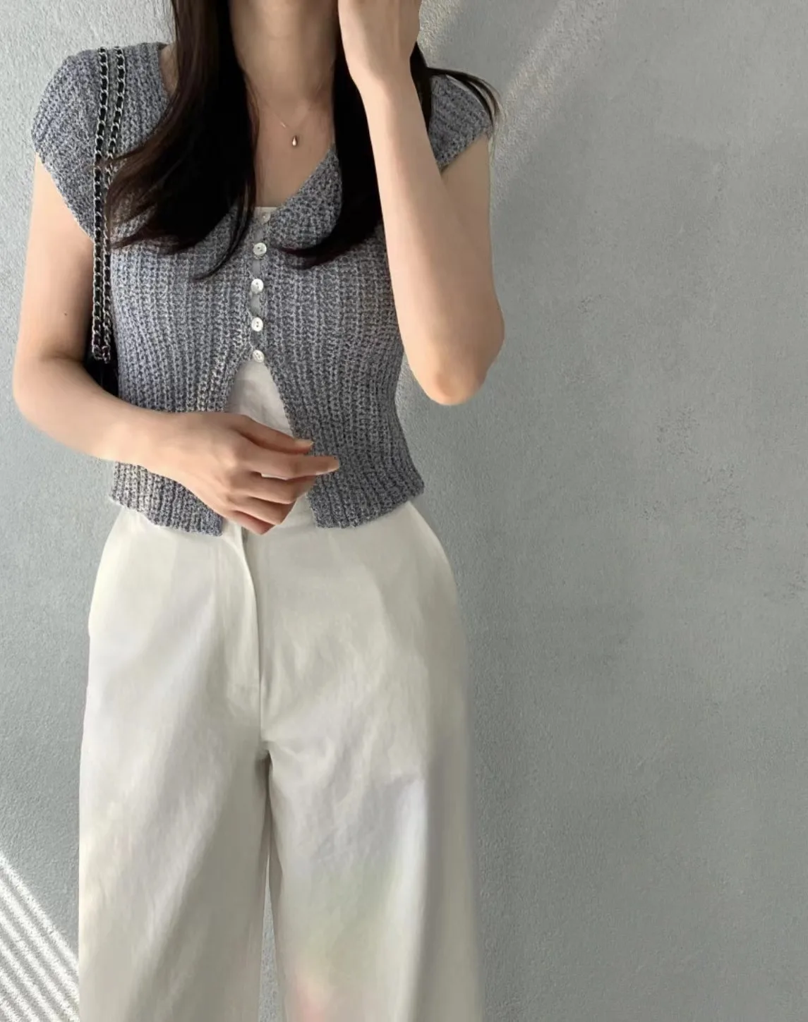 Pbong  Korean  Cropped Cardigan Women Clothing Short Sleeve V-neck Solid Top Fashion Single Breasted Split Knitting Sweater