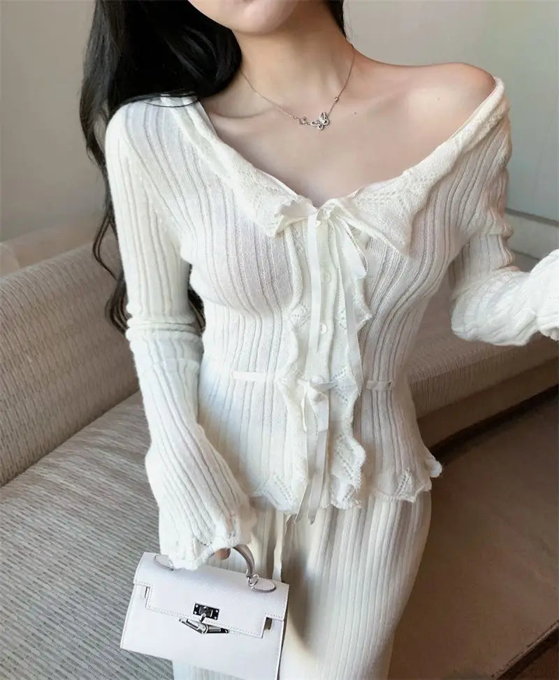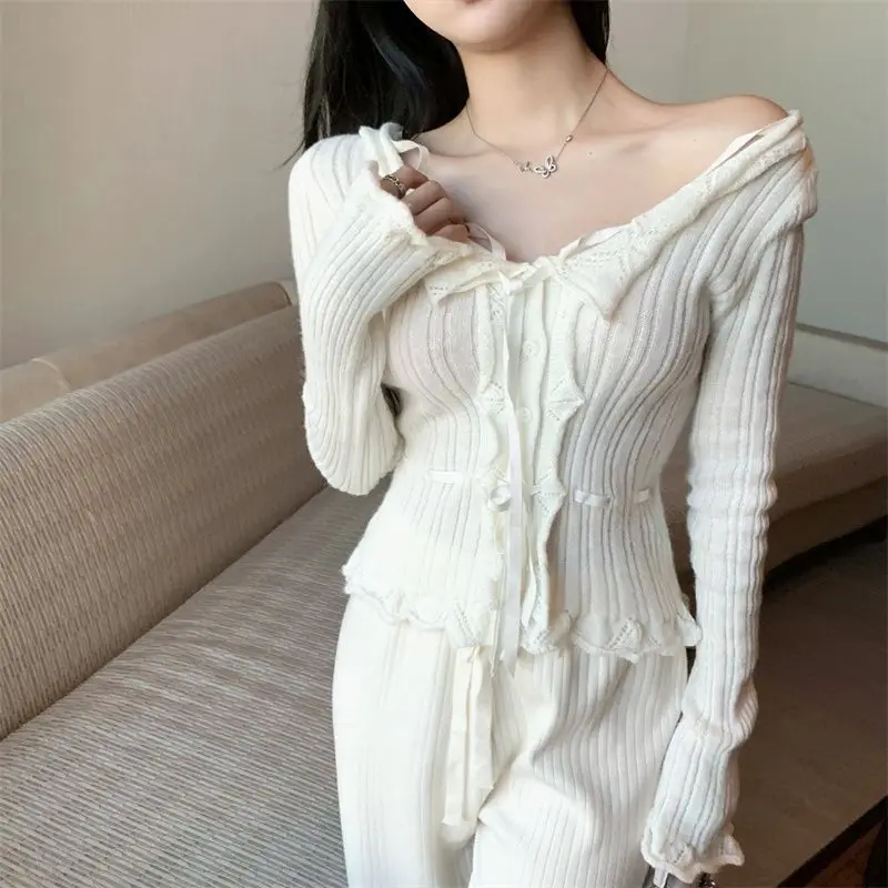 Pbong  Sexy Sweater Long Sleeve Cropped Cardigan V Neck Hollow Out  Knit Lace Up Top Bandage Single Breasted Tops