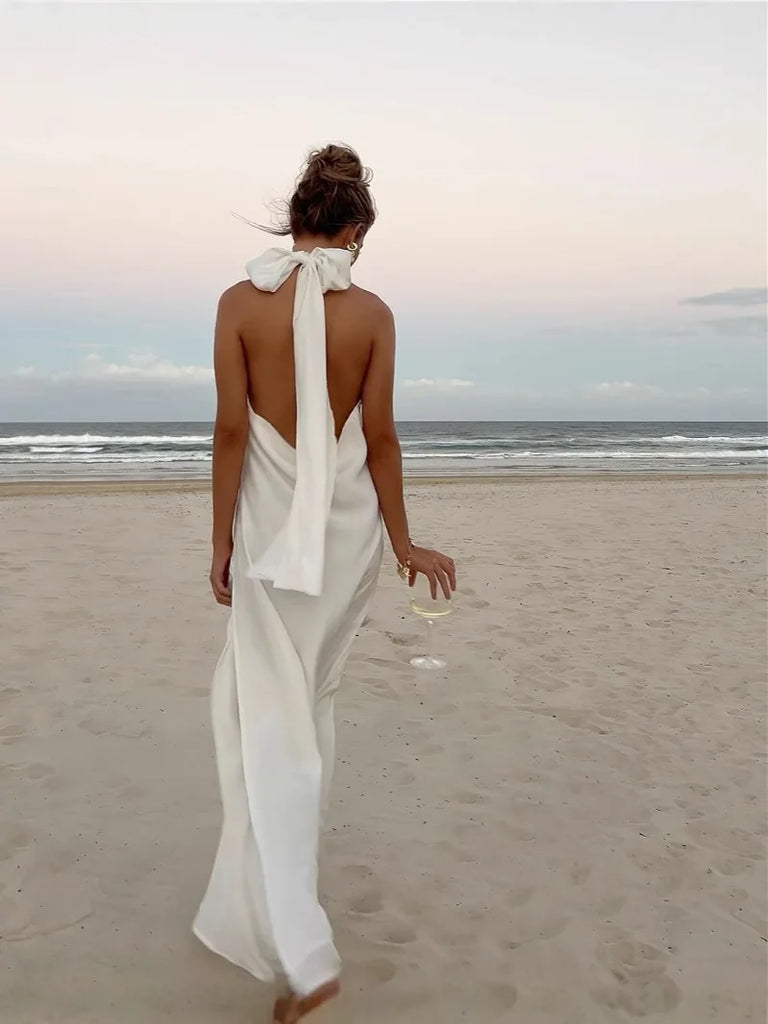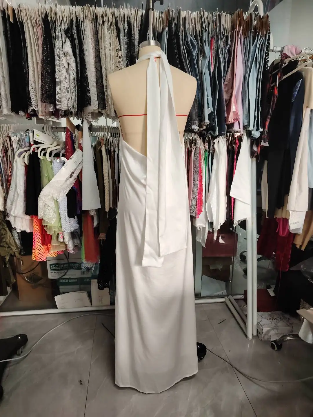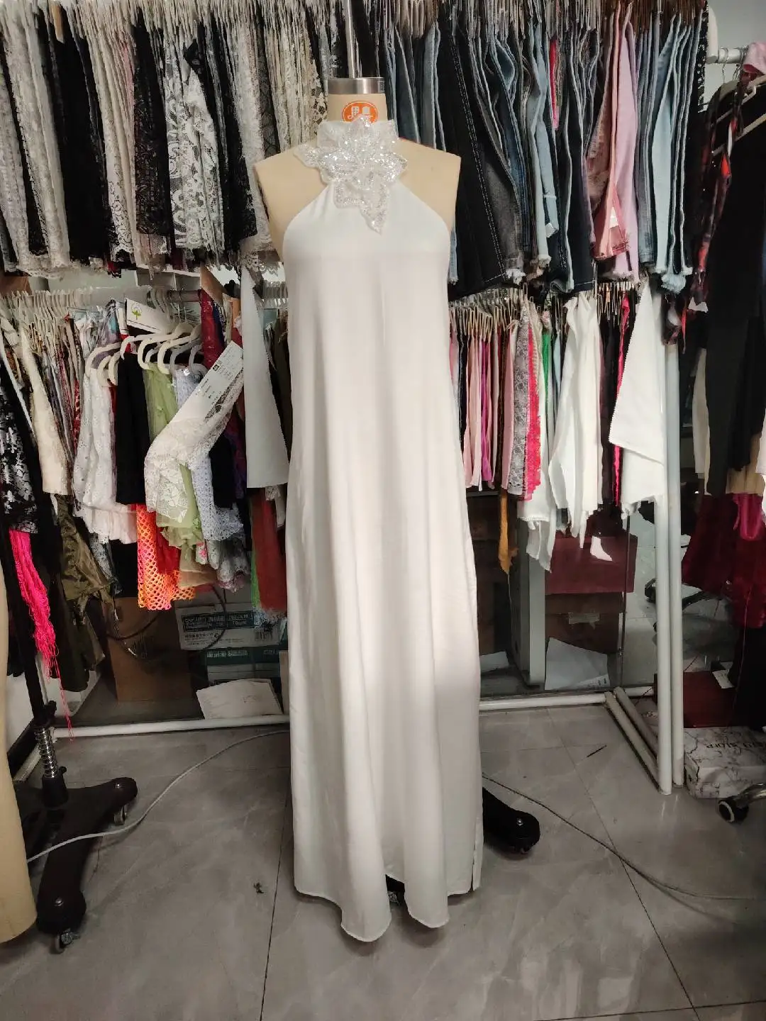 Pbong Sexy Women's White Floral Crochet Satin Halter Evening Dress, Vintage Style Maxi Gown for Summer