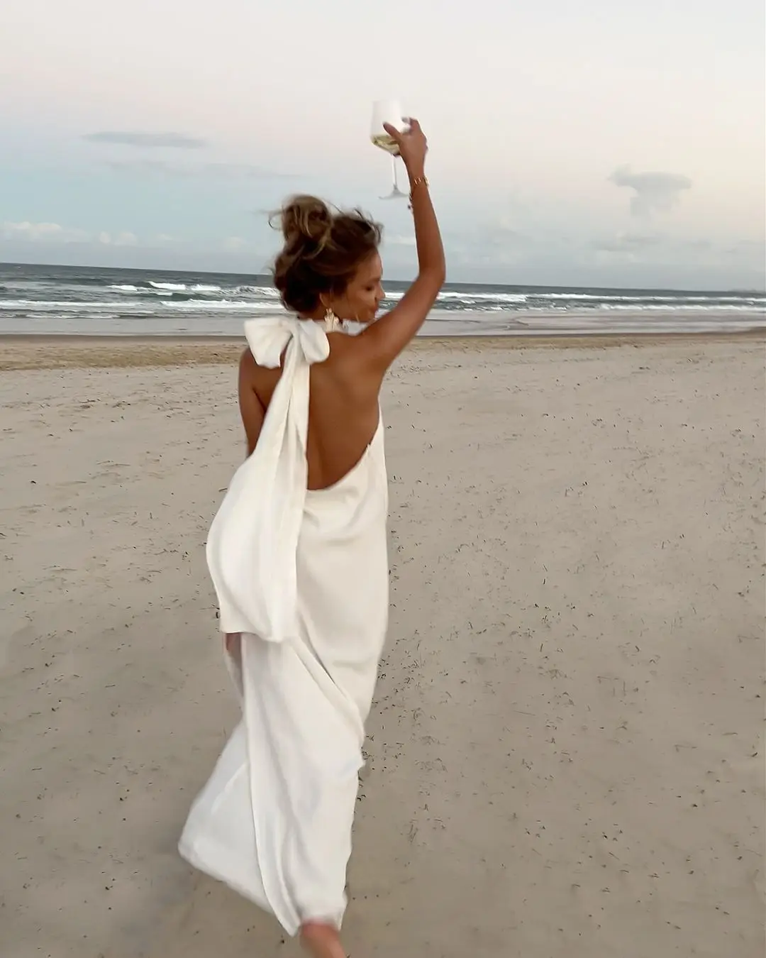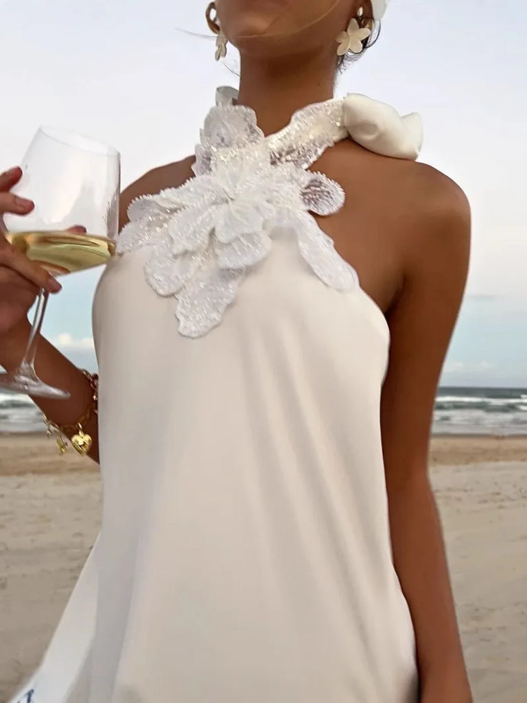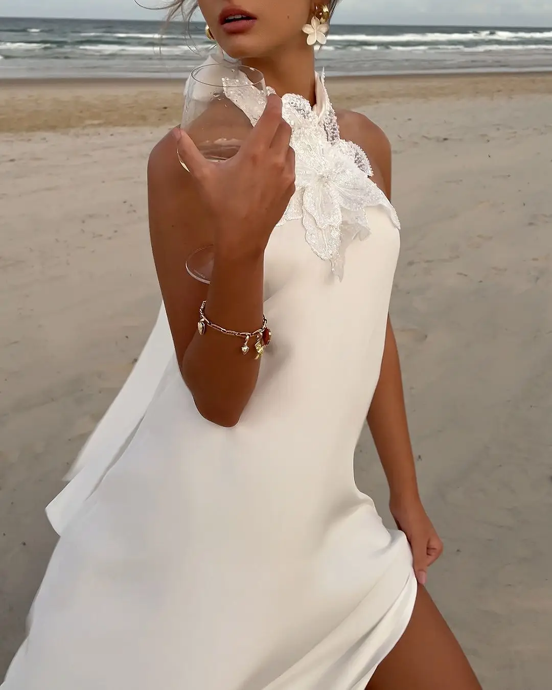Pbong Sexy Women's White Floral Crochet Satin Halter Evening Dress, Vintage Style Maxi Gown for Summer