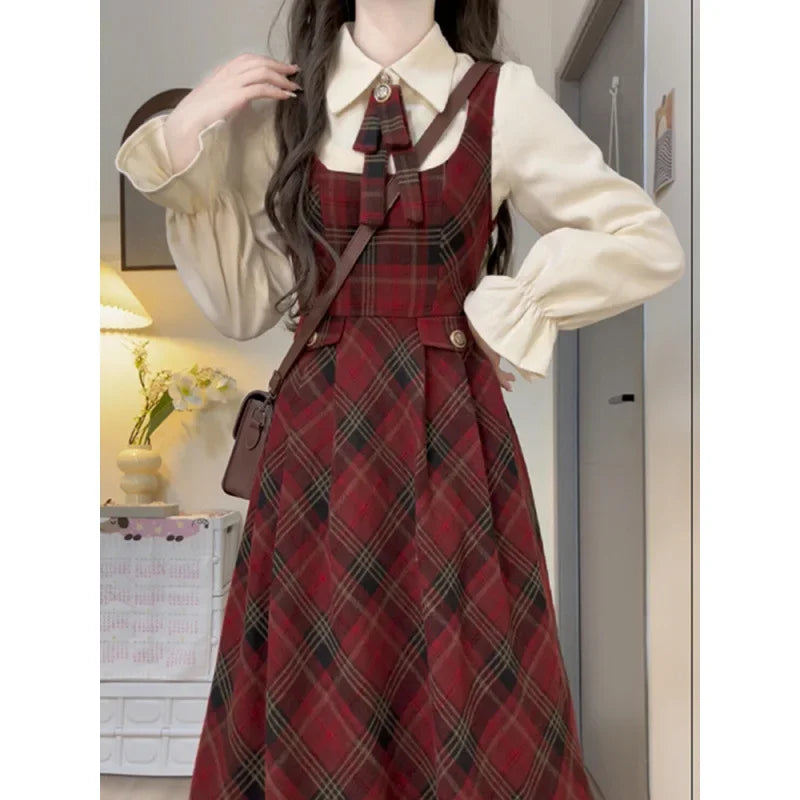 Pbong  Single Piece School Style Japanese Plaid Strap Dress Women Student Waist Cinching Slimming Midi Length Overalls Skirt Set