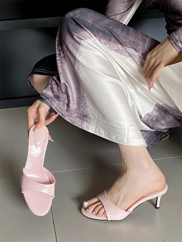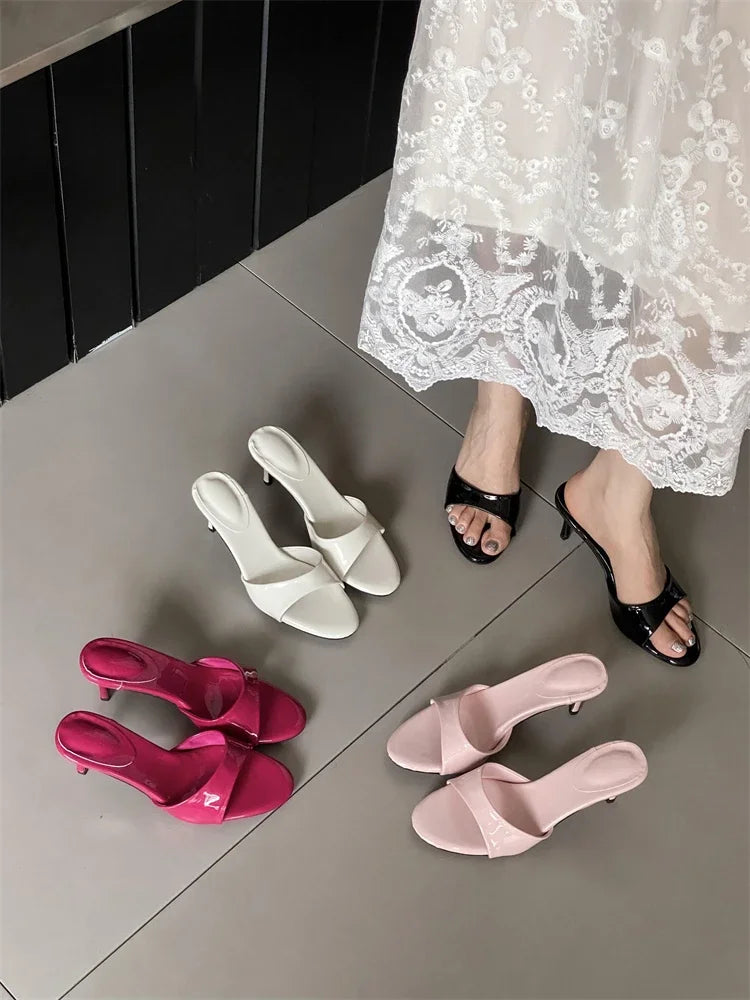 Pbong Summer Patent Leather Open Toe Slippers Fashion Thin Low Heels Beach Prom Slide Prom Slide Shoes