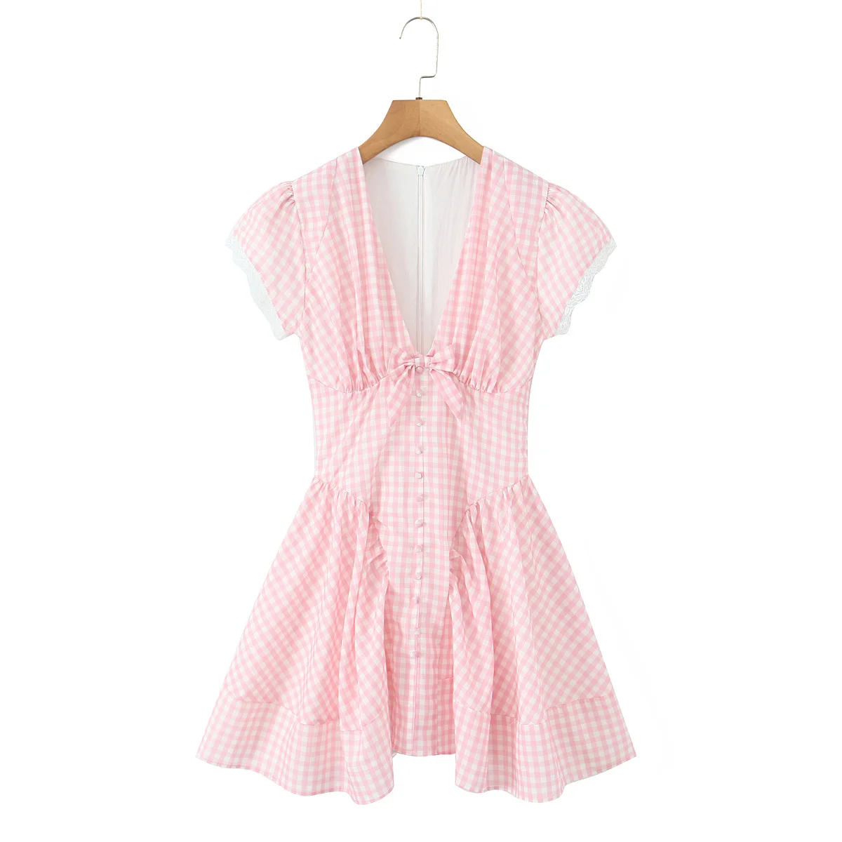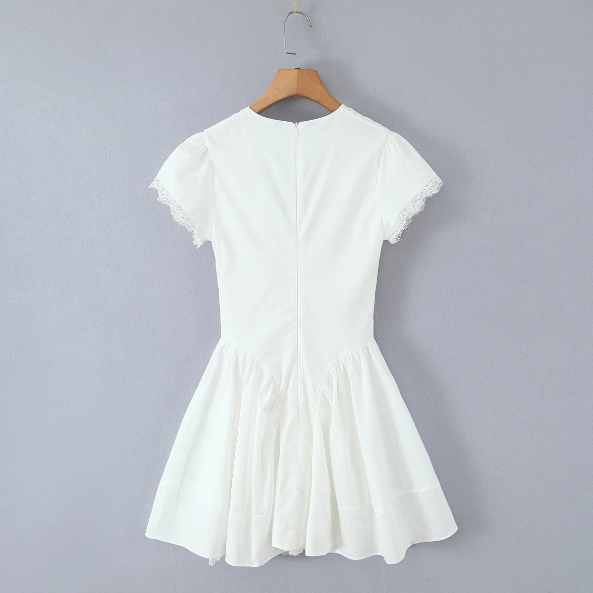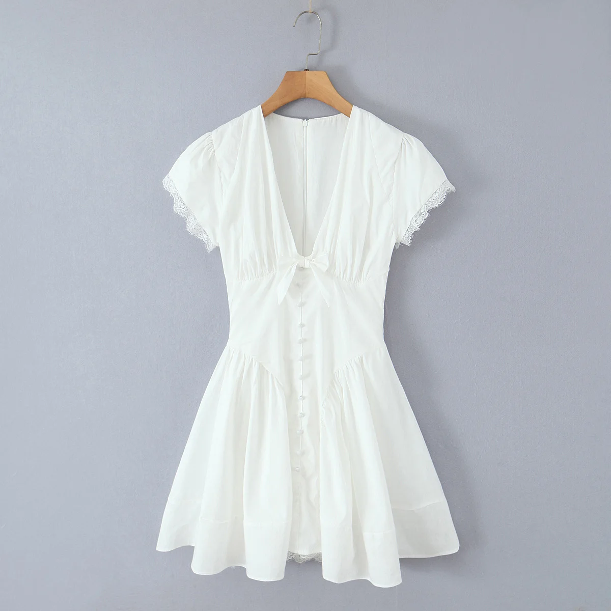 Pbong Sweet Cute White Mini Dress For Pretty Girl Elegant A-line Bow V Neck Summer Dresses Party Robe Vacation Vestidos