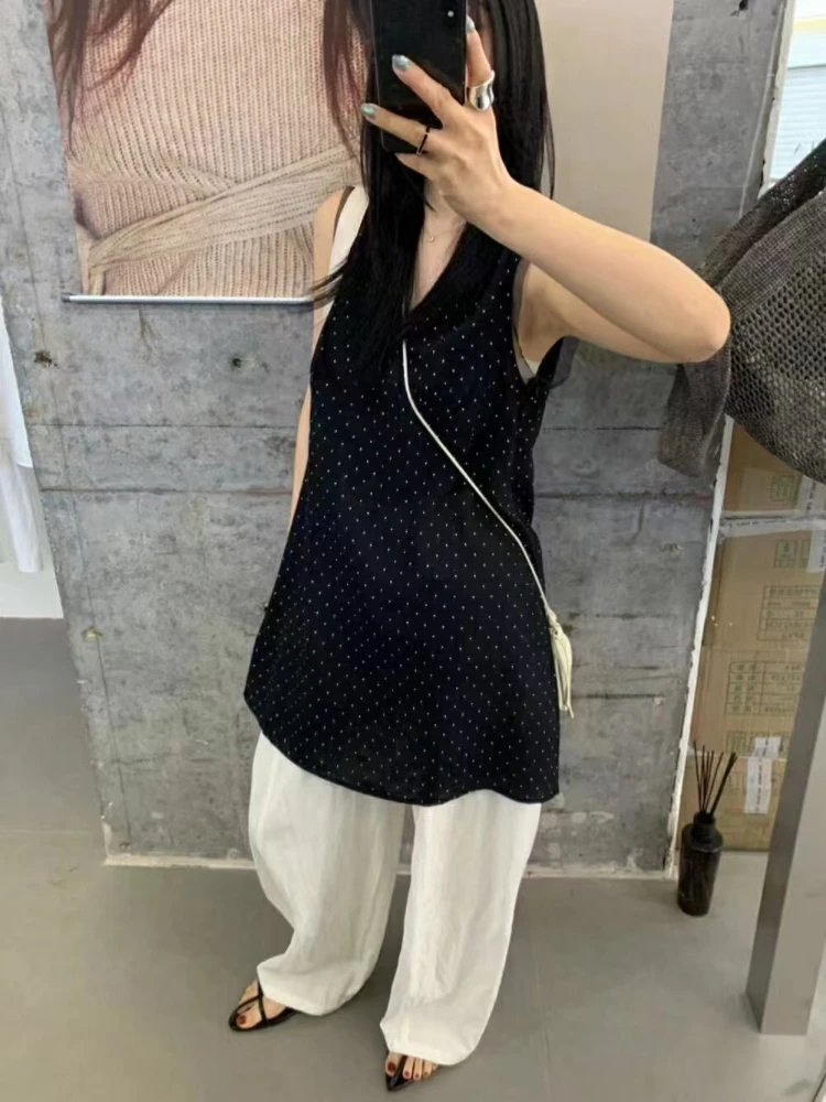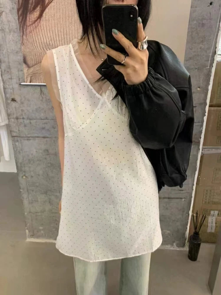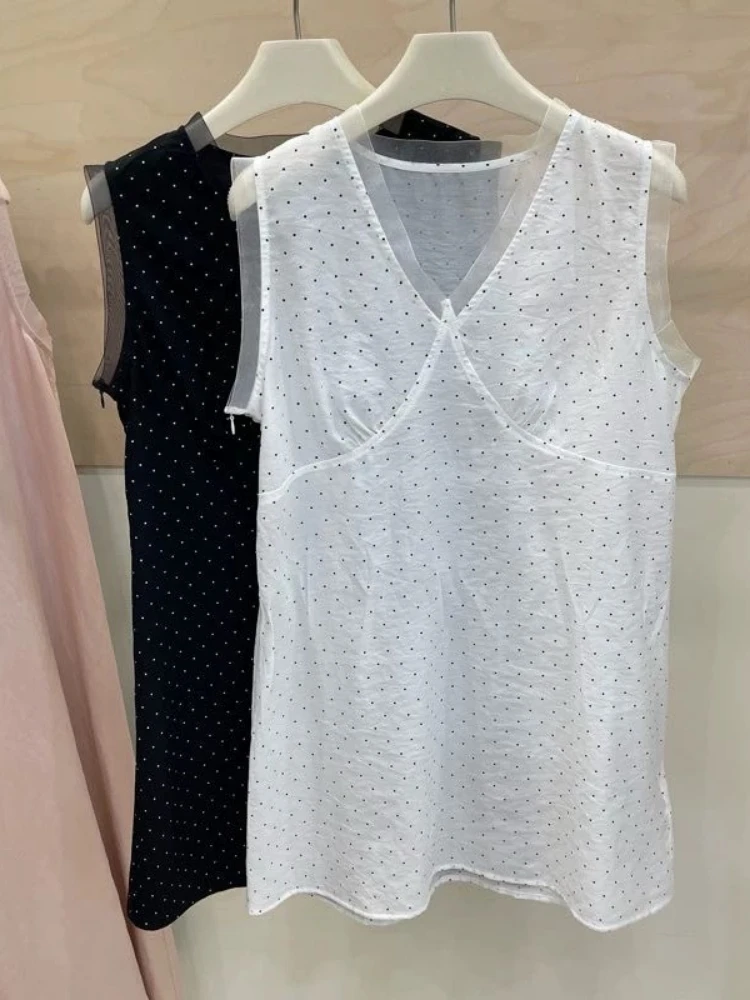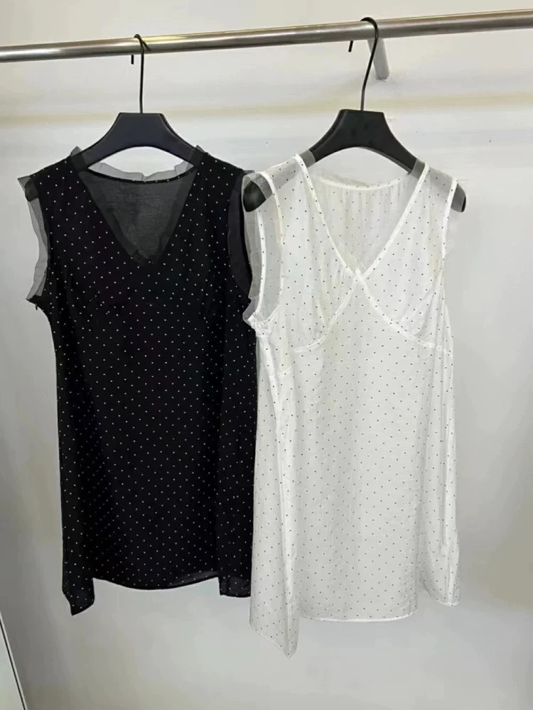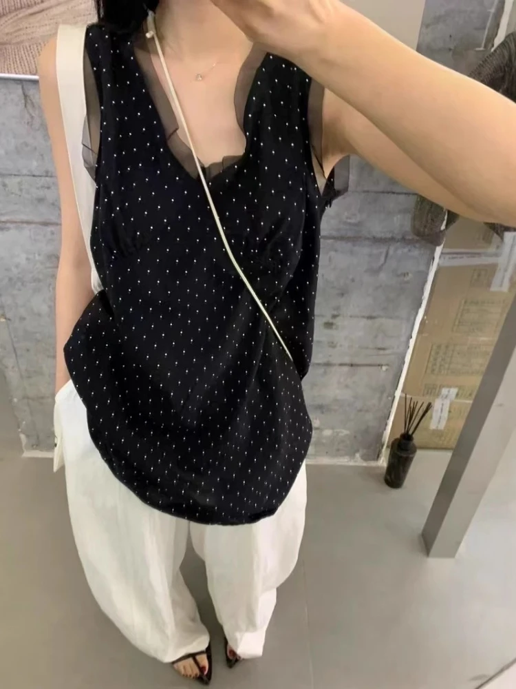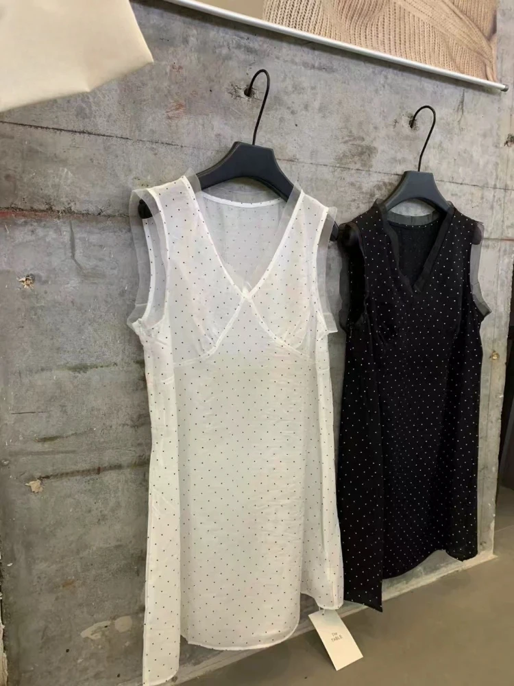 Pbong Women Clothing V-neck Polka Dot Dresses Vintage Summer Sleeveless Robe Femme Gauze Patchwork Mini Dress
