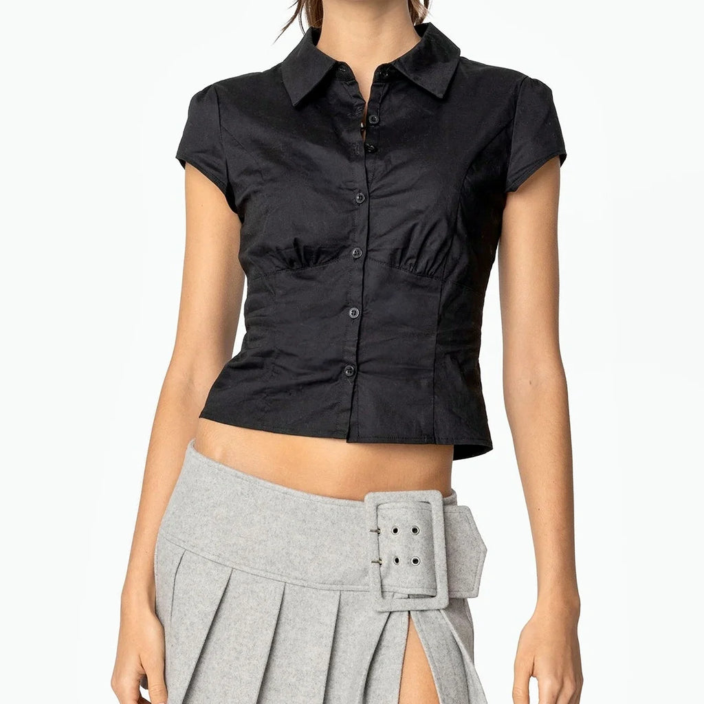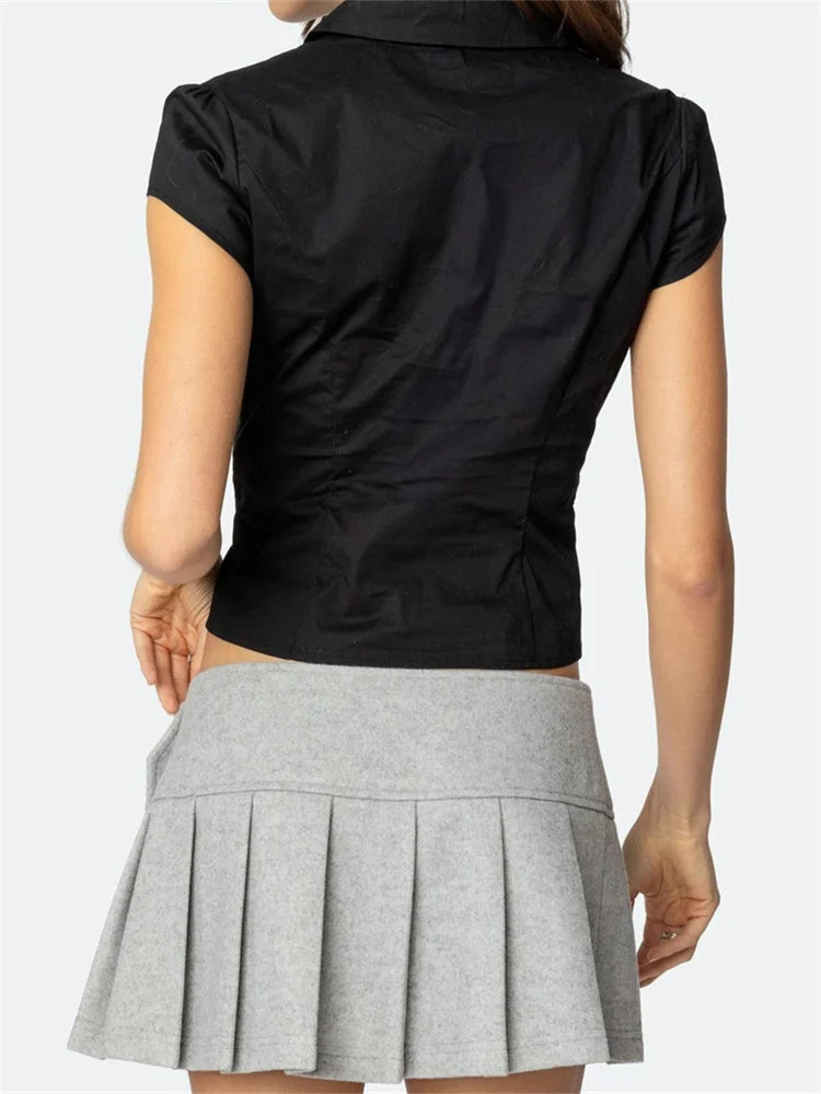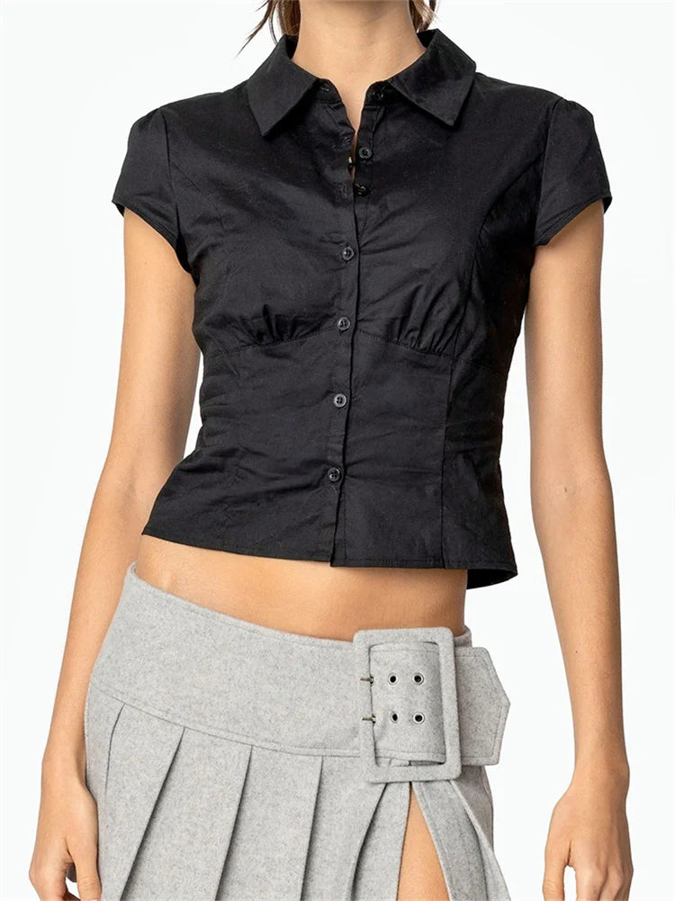 Pbong Women Shirts Button down Solid Color Crop Short Sleeve Tops Blouse for Streetwear Casual Y2K Aesthetic Clothes