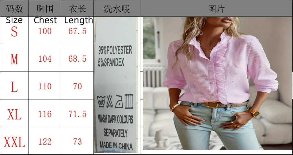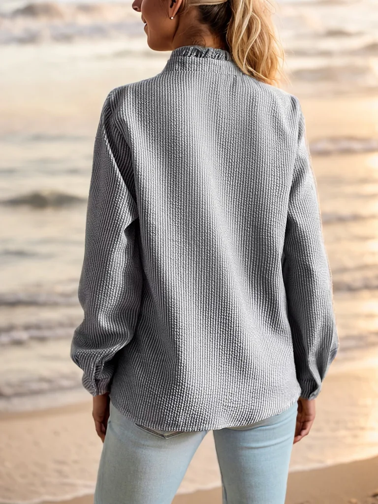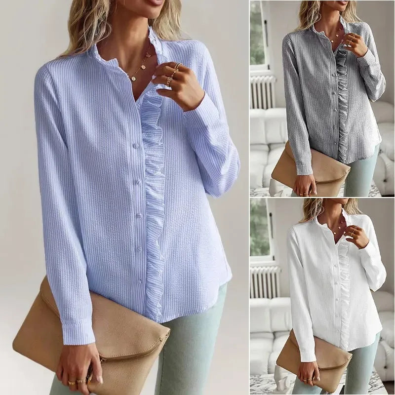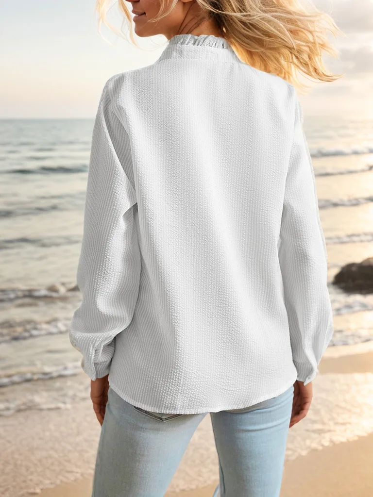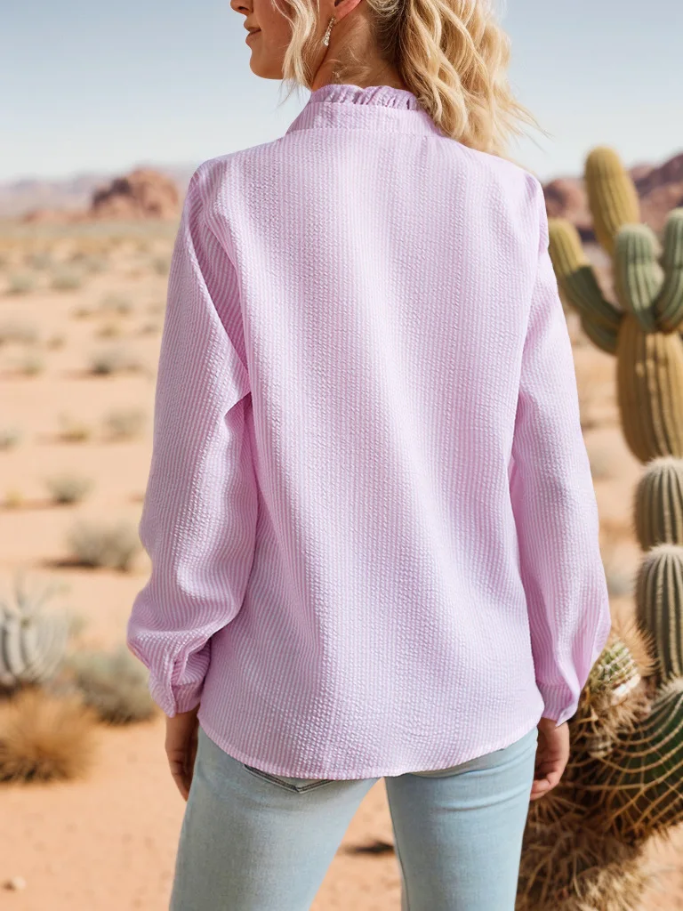 Pbong  women's blouse,Stand collar autumn frilled cardigan with ruffled edges, long-sleeved bubble top