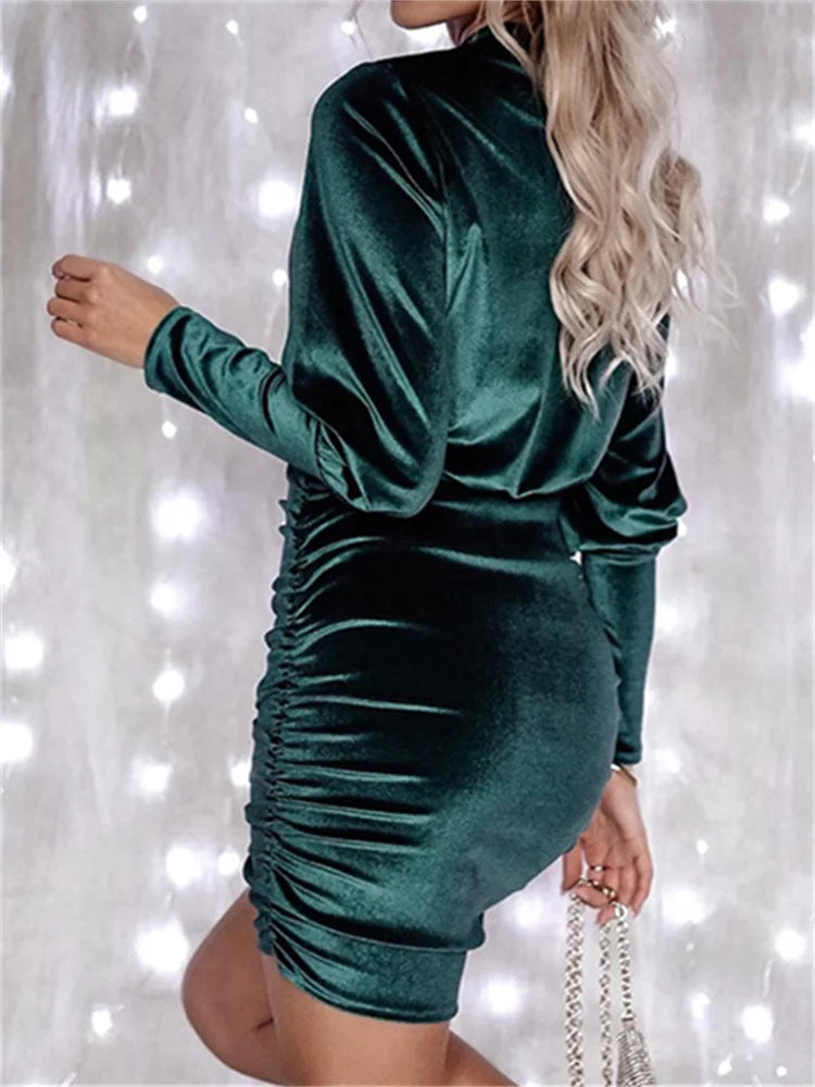 Pbong Women's Fall Velvet Dress Solid Color Round Neck Lantern Long Sleeve Ruched Bodycon Mini Dresses Party Elegant