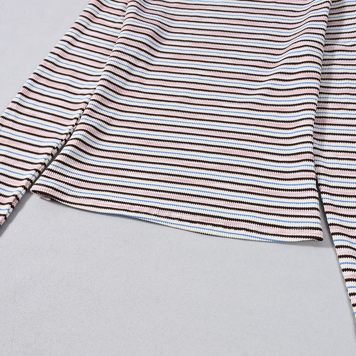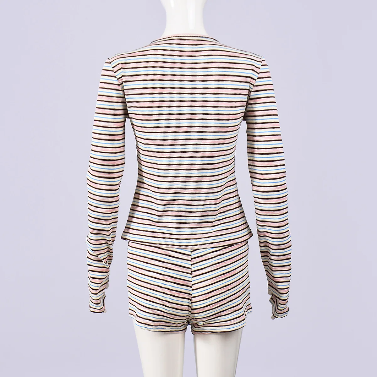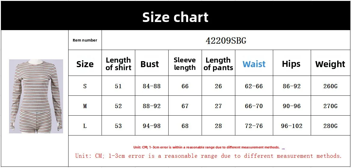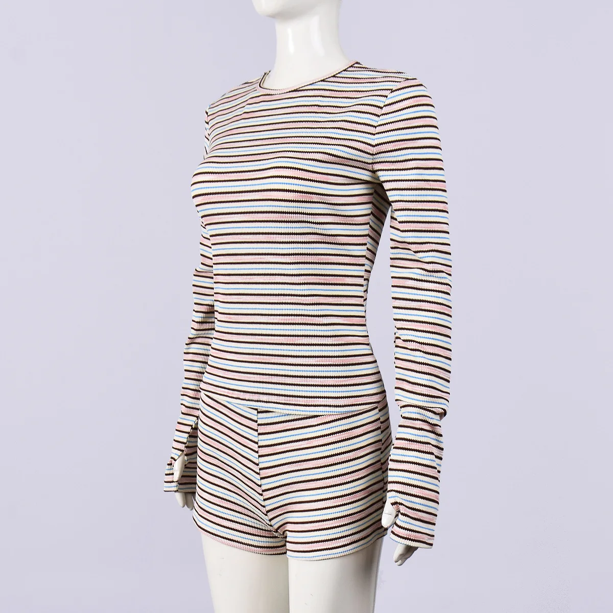 Pbong Women's Sexy Hot Pants Set round Neck Long Sleeve Color Woven Stripe Fabric T-shirt Top Trendy Street Style Casual Outfit