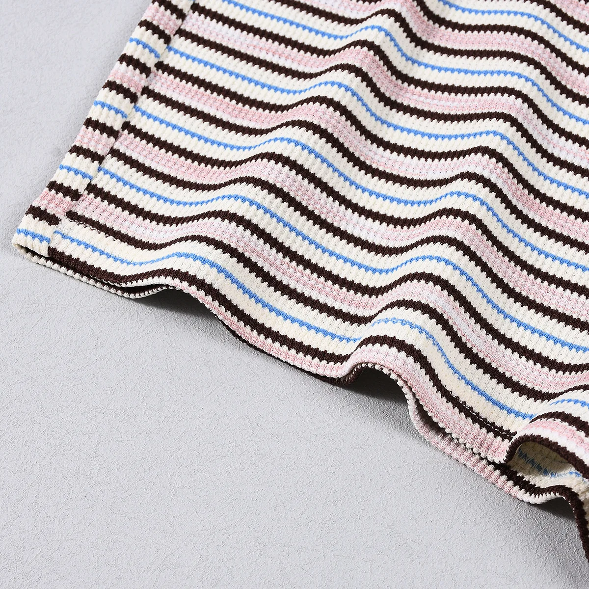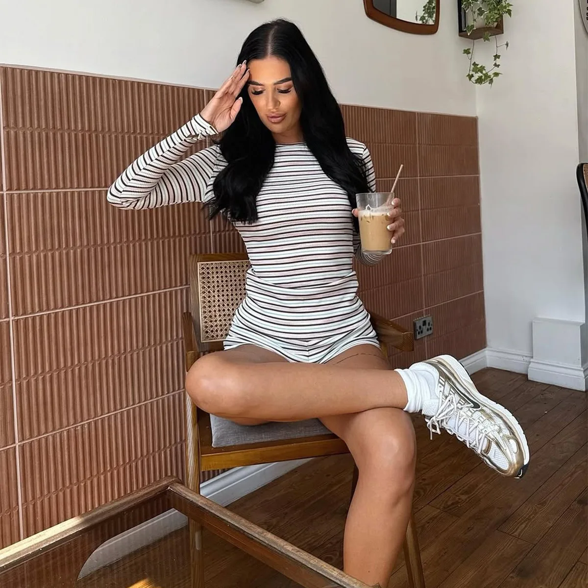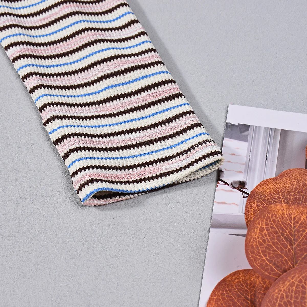 Pbong Women's Sexy Hot Pants Set round Neck Long Sleeve Color Woven Stripe Fabric T-shirt Top Trendy Street Style Casual Outfit