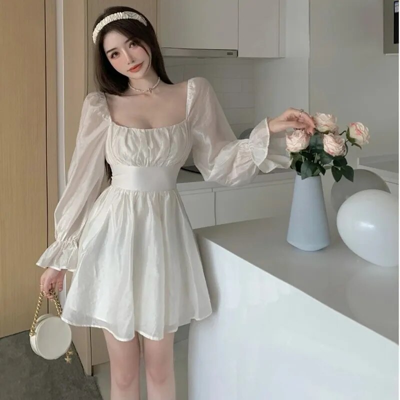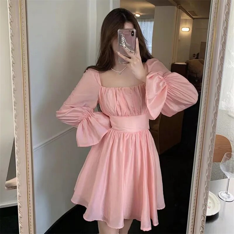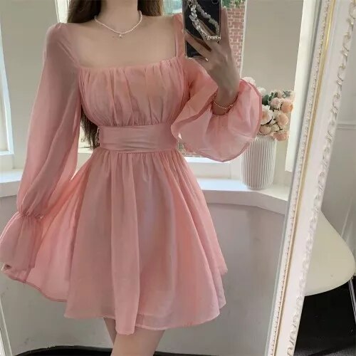 Pink Sweet Elegant Princess Dress Women Casual Korean Slim Long Sleeve Fairy Dress Female Backless Design Vintage Dress