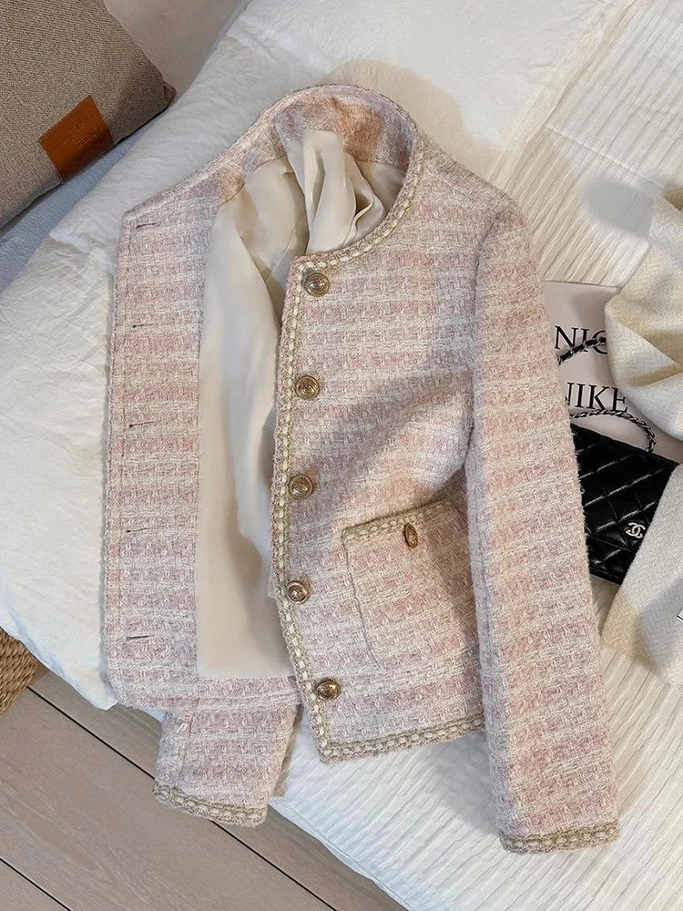 Pink Women Sweet Tweed Jacket Vintage Long Sleeve Slim O Neck Coat Korean Fall Winter Retro Small Fragrance Elegant Tops