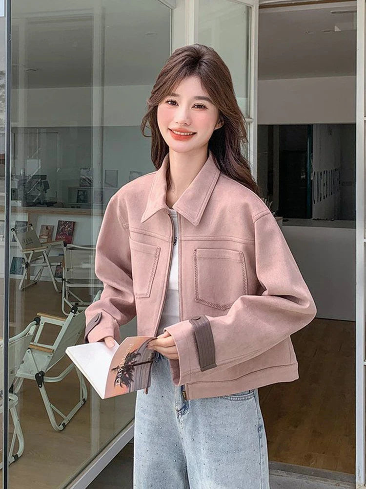 Pink Y2K Faux Suede Jacket Women Vintage Streetwear Long Sleeve Loose Coat Korean Casual Harajuku Fall Winter Outwear Tops