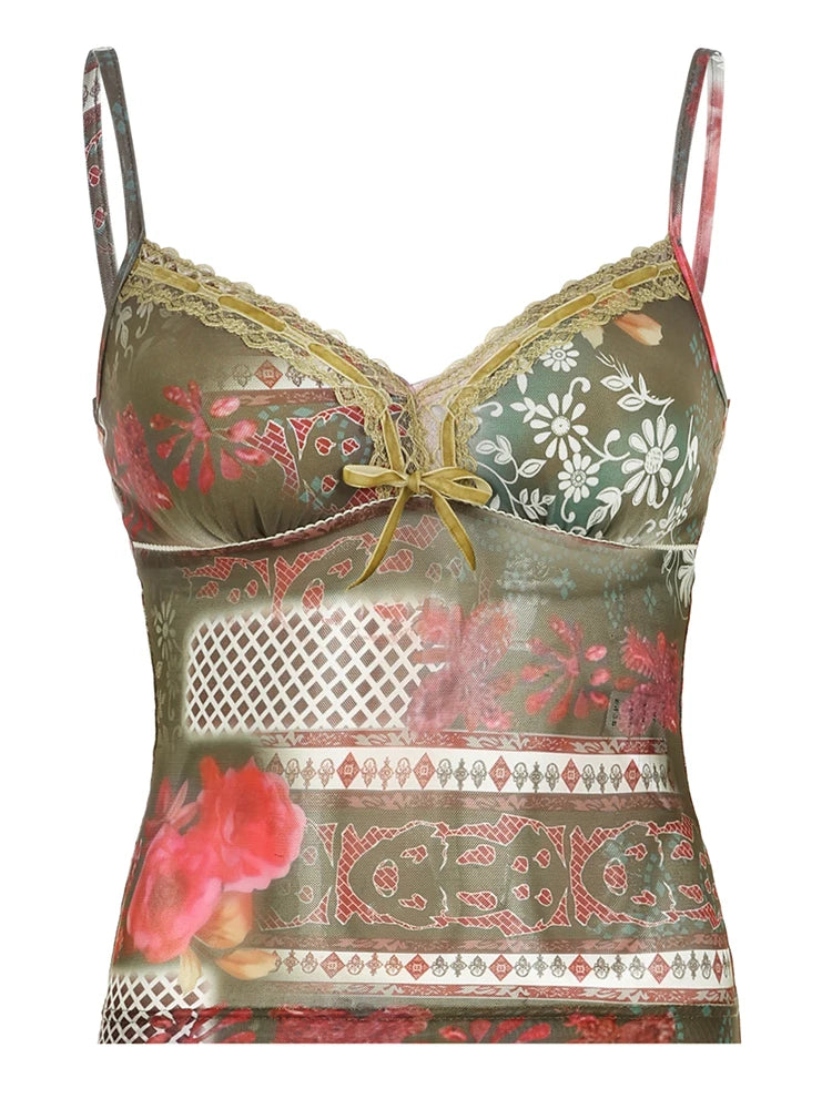 Plant And Floral Print Vintage Y2K Aesthetic Mesh Camisole Women Tie Lace Trim Cute Kawaii Clothes