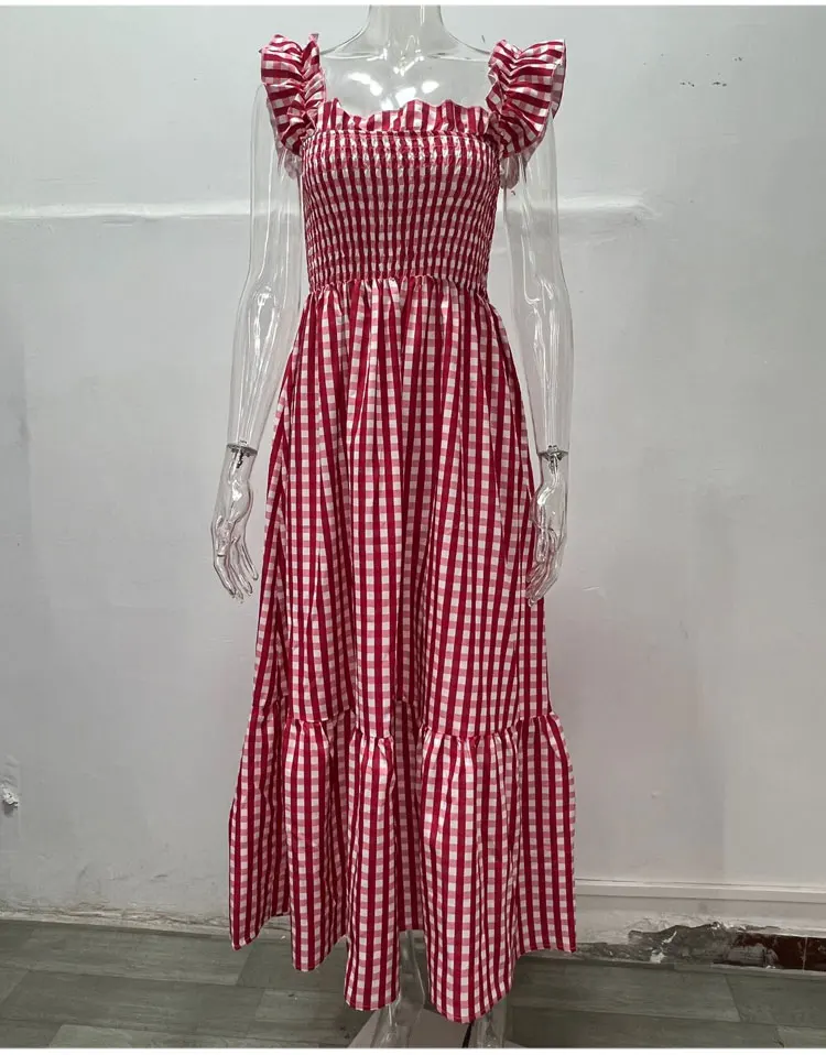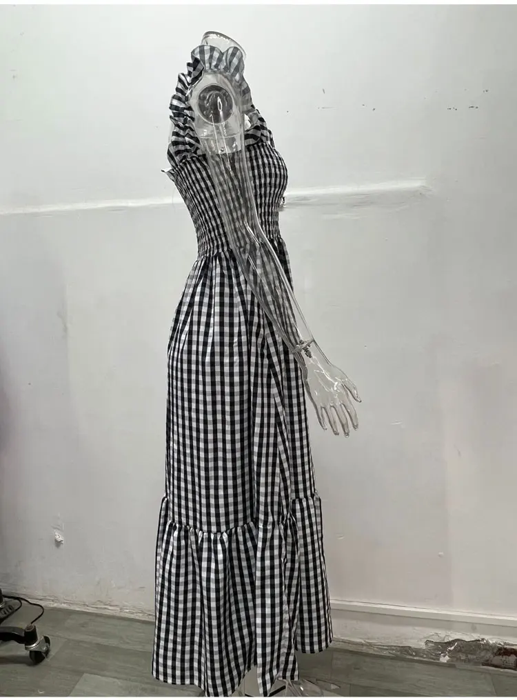 Pleate Loose Retro Sleeveless Checkere Dress Summer Fashion Women's Bohemian Casual Large Hem Dress Slip Dress Beach Sundress