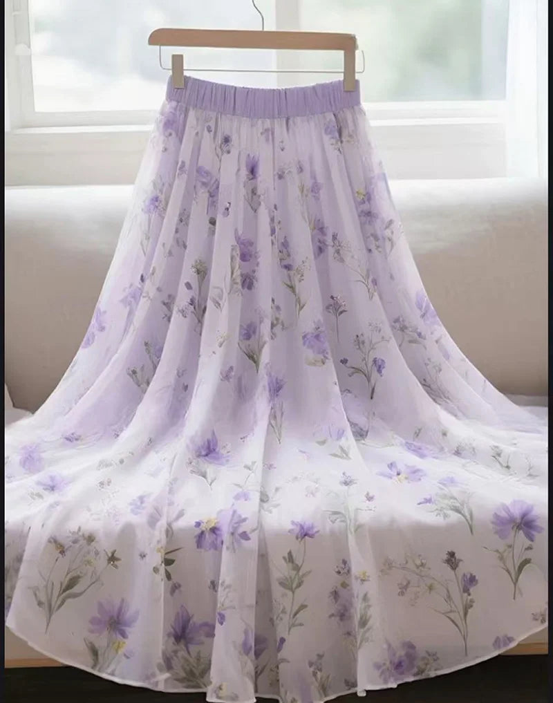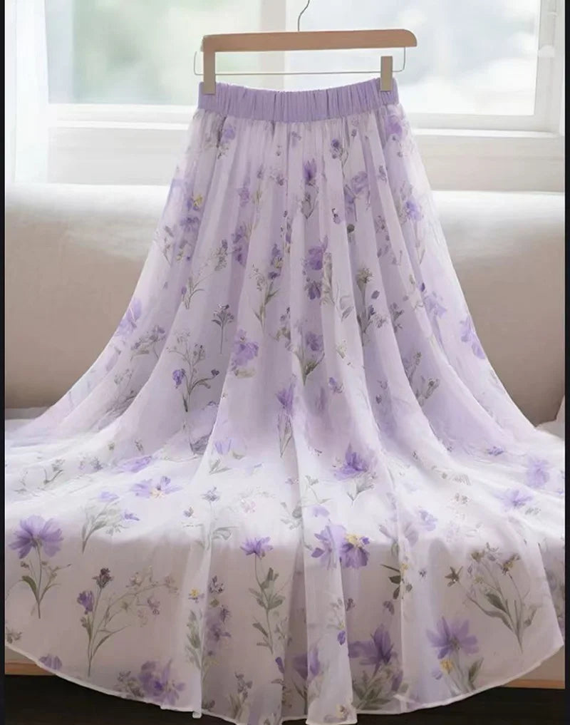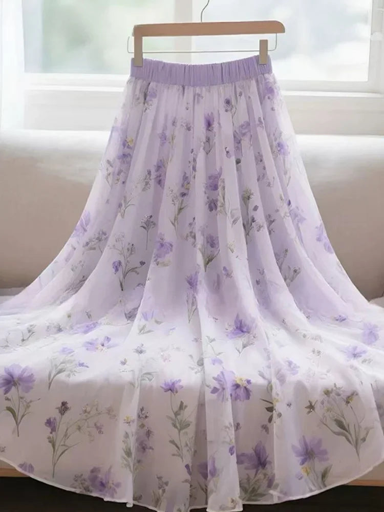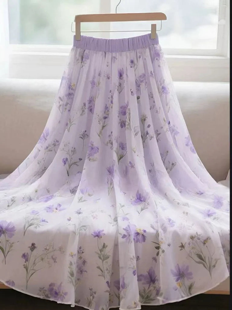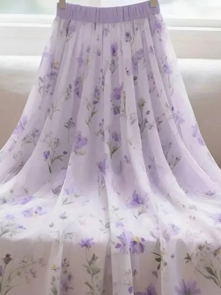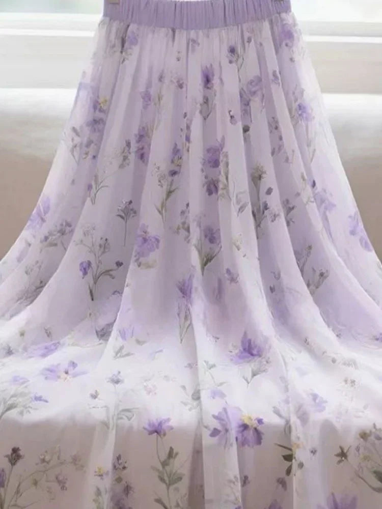 Purple Floral Chiffon Long Skirt Women High Waist Sweet Vintage Elegant Skirts Korean Casual Summer Soft Retro Long Skirts