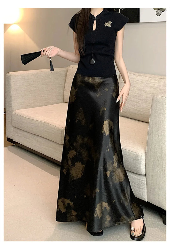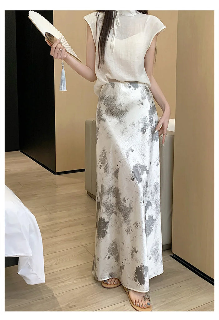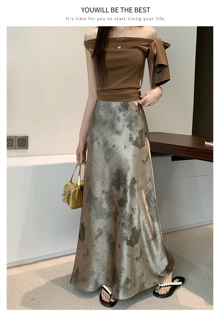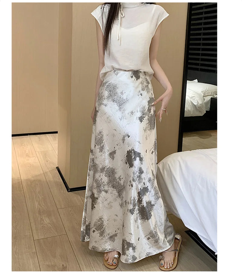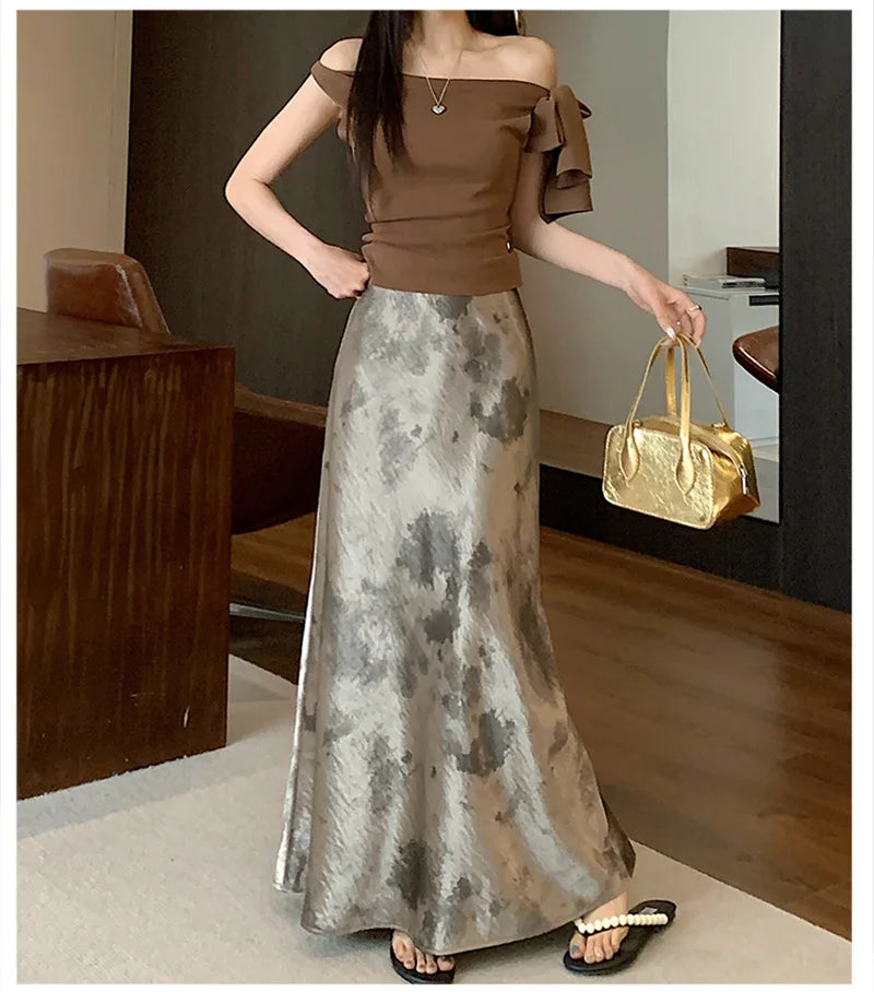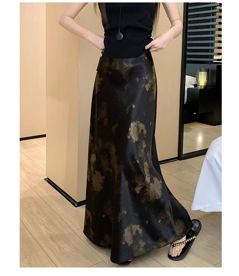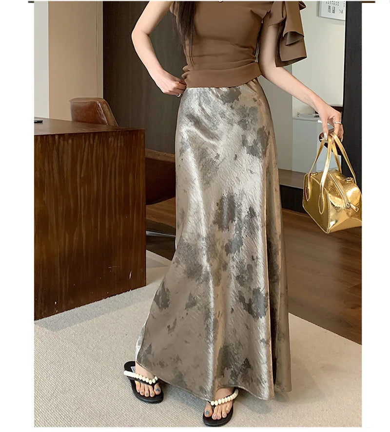 Retro Tie Dye Satin Long Skirts Women Elegant Korean Vintage Slim Trumpet Skirt Casual Summer Sweet Comfortable Long Skirt