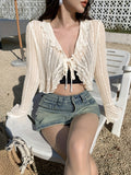 Ruffle Trim Tie Front Cardigan, Chic Long Flare Sleeve V Neck Crop Cardigan For Spring & Fall, Women's Clothing