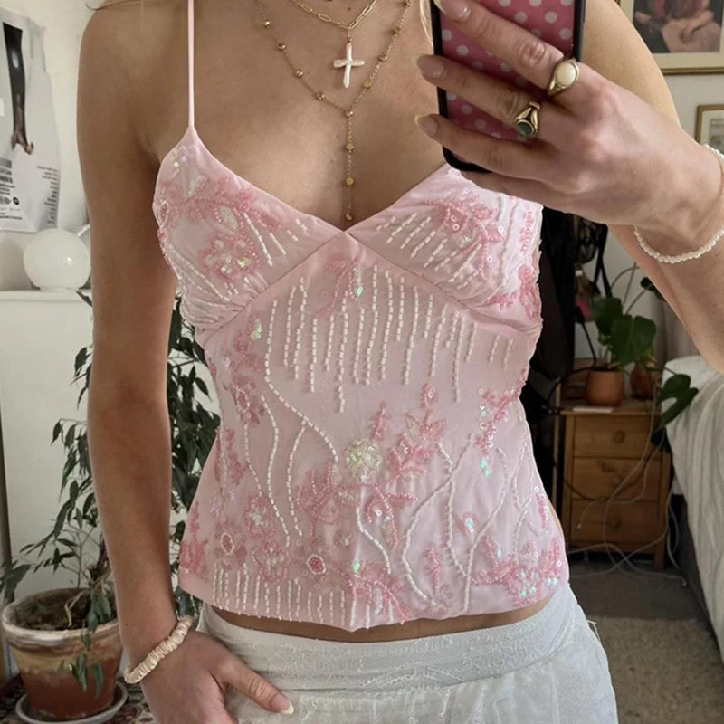 Sexy Sequin Rhinestone Crop Tops Women Y2k Fairy Coquette Camis Pearl Glitter V Neck Backless Tank Shirt Vest Beach