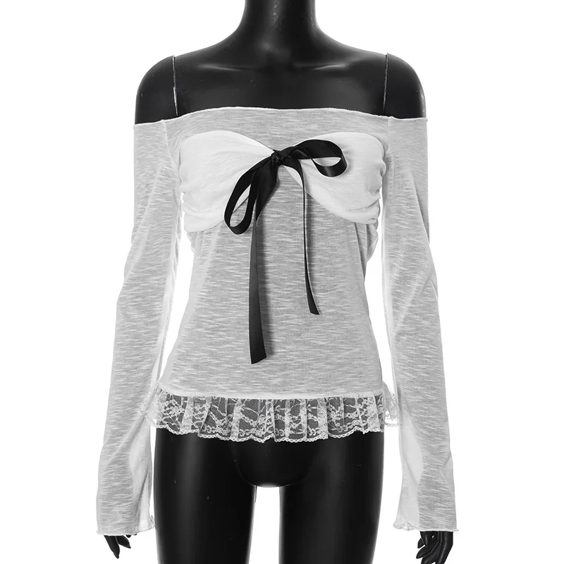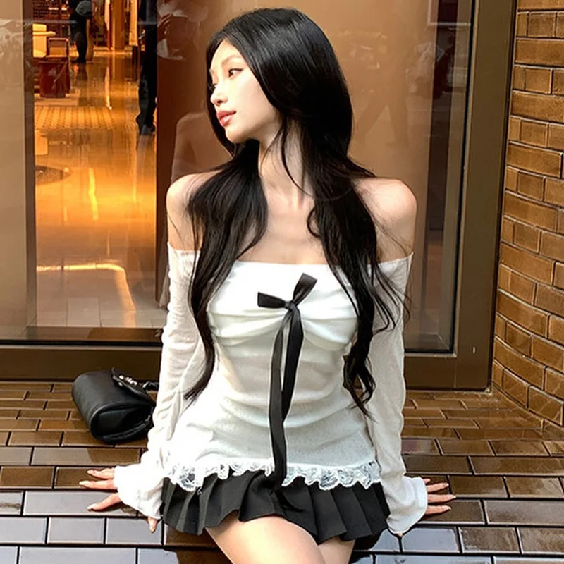 Slash Neck Korean Sexy High Street All Match Casual Shirts Front Pleated Bow Appliques Girl Tops Y2k Aesthetic Girl Clothing