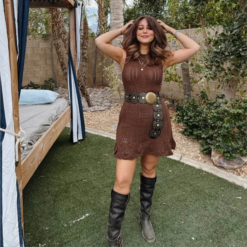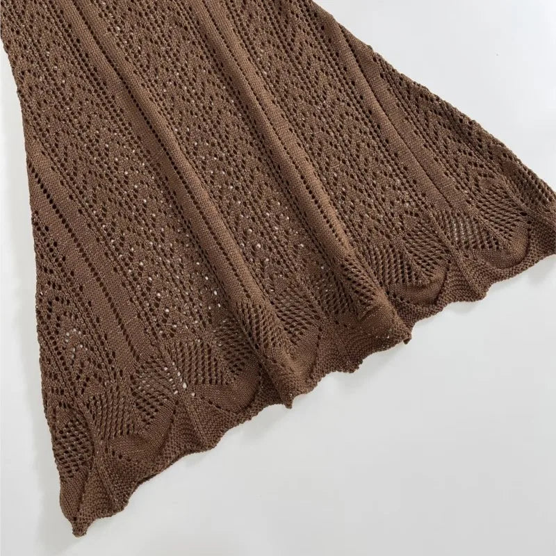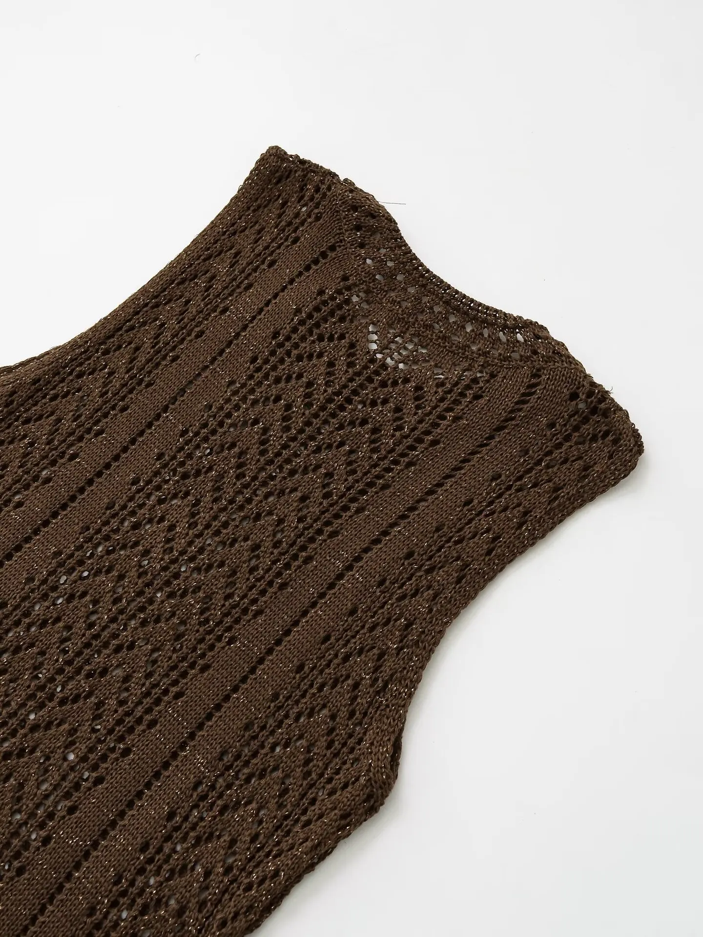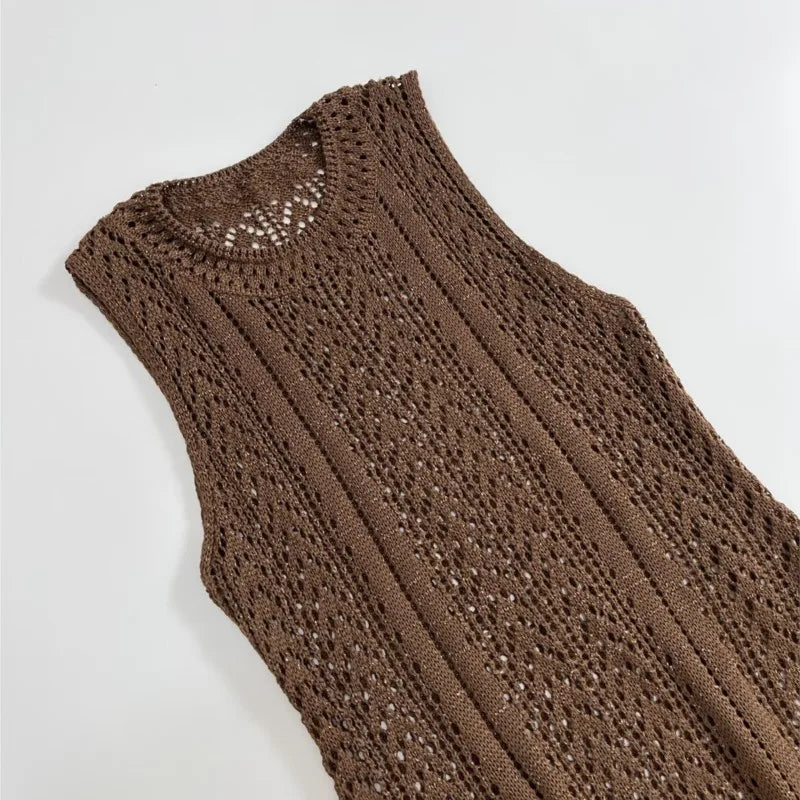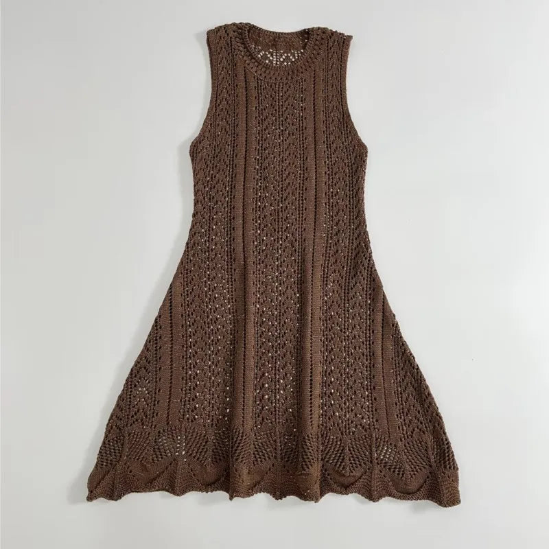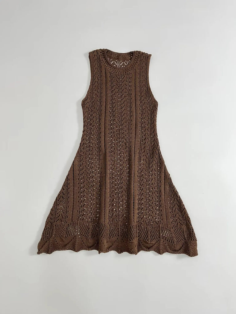 Slim Fit O Neck Hollow Sleeveless Knitted Short Dress Solid Color Brown Streetwear Women Dress Fashion Retro Vestidos New