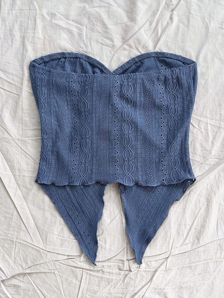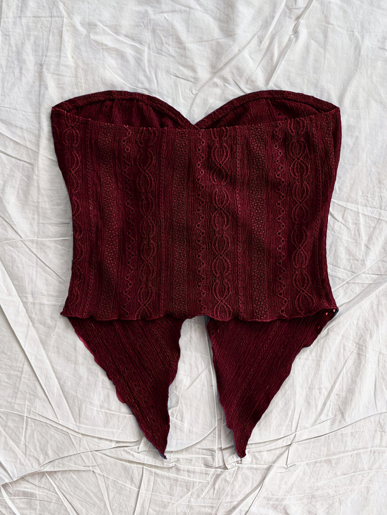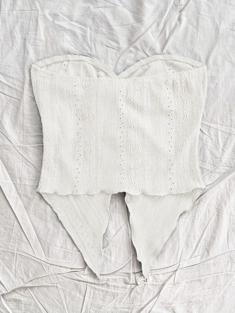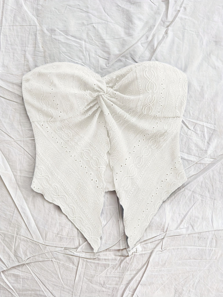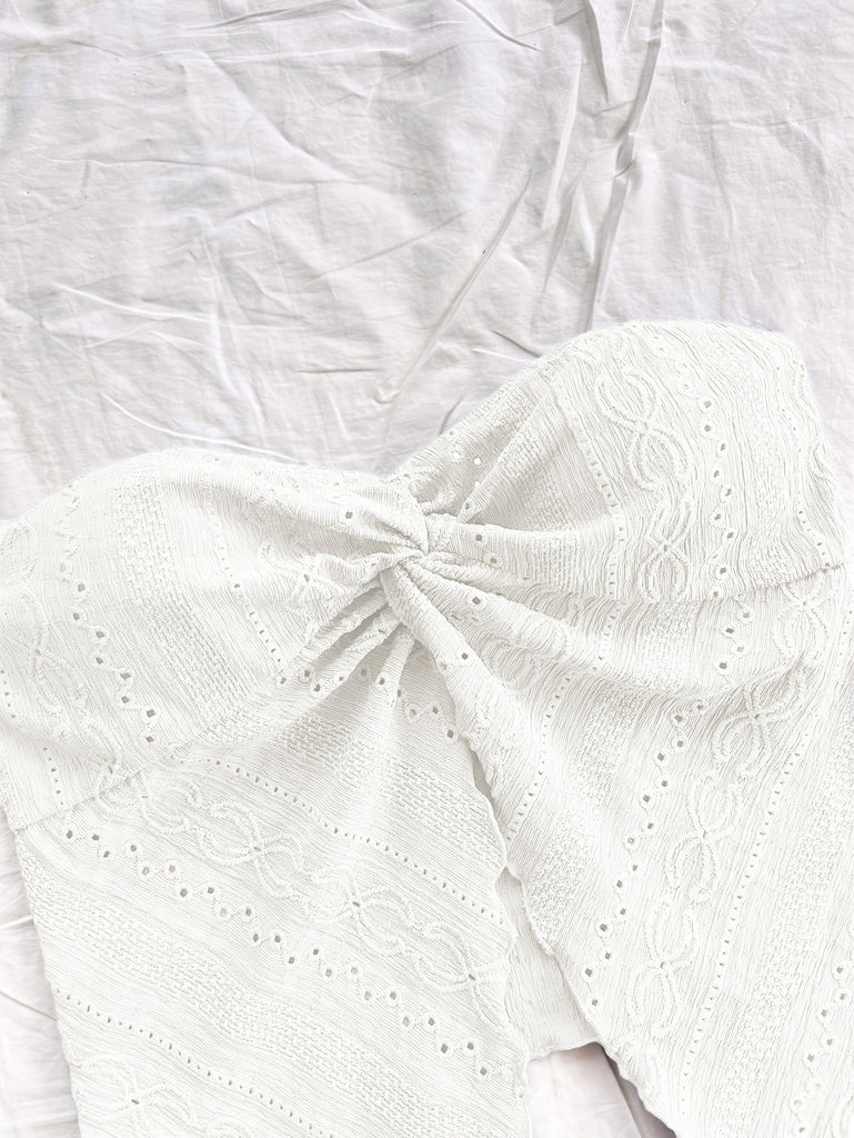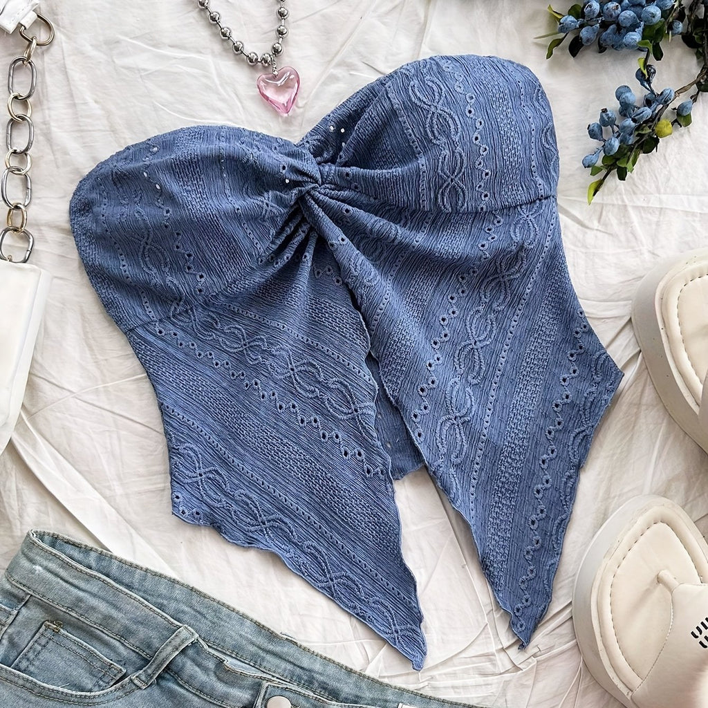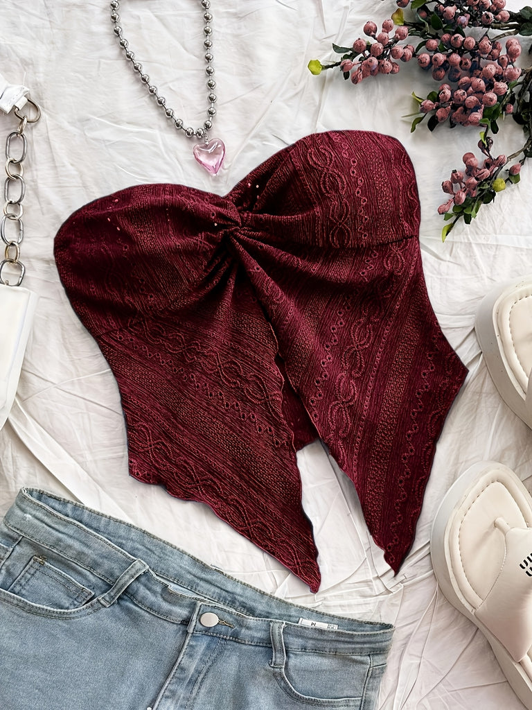 [Solid Strapless Lace Bandeau Top] Elegant Lace Hollow Bandeau Top, Polyester and Elastane Blend, Knit Fabric, Solid Color, Strapless Design, for All Seasons