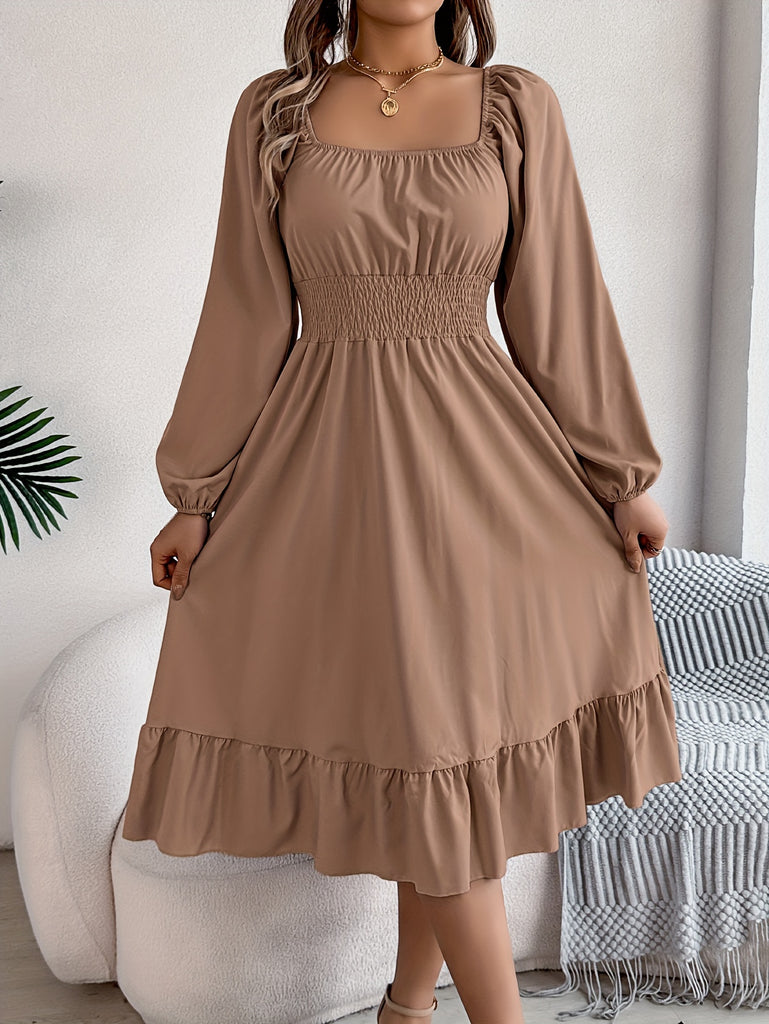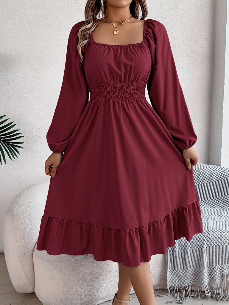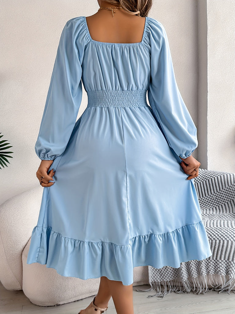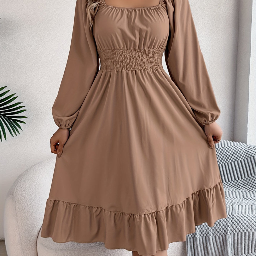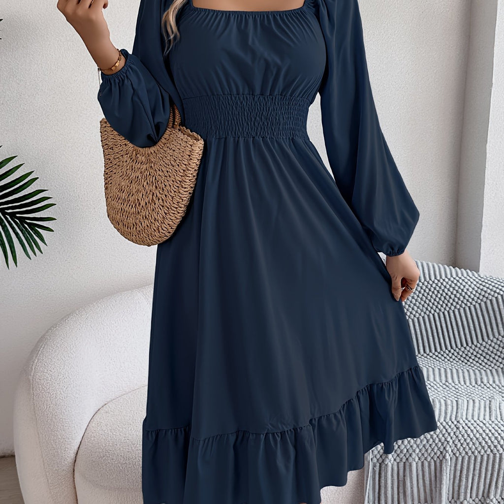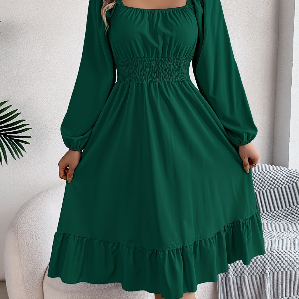 Stunning Ruffle Hem A-Line Dress - Women's Elegant Solid Color Square Neck Backless Shirred Clothing with Lantern Sleeves - Perfect for Formal Occasions and Parties