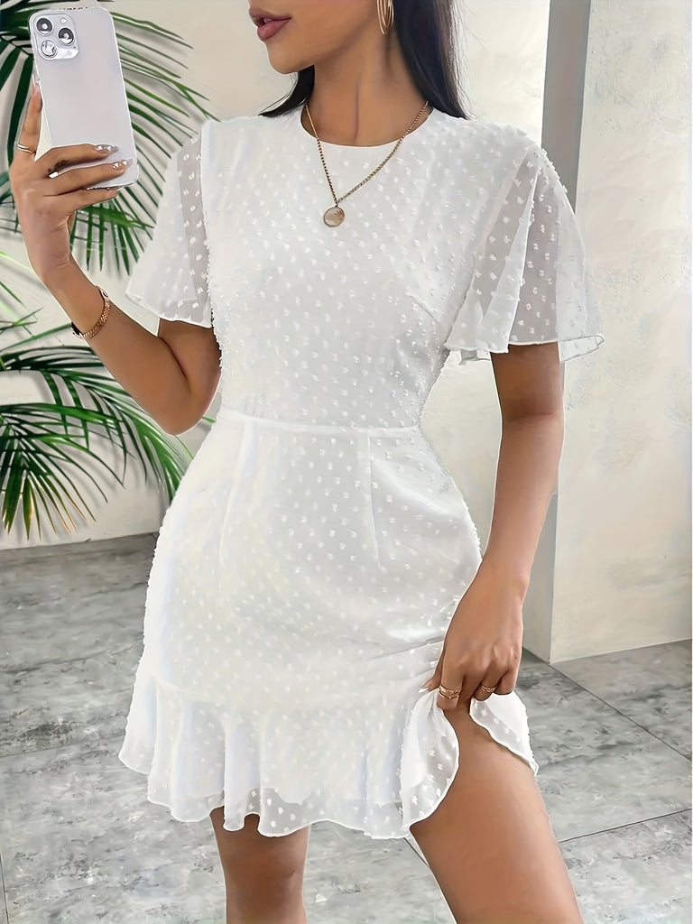 [Summer Chiffon Ruffle Dress] Summer Fashion Solid Color Chiffon Ruffle Hem Dress - Casual Crew Neck Short Sleeve A-Line Pendulum - 95% Polyester 5% Elastane