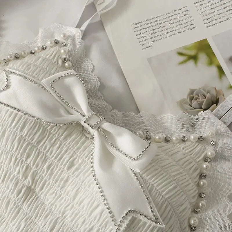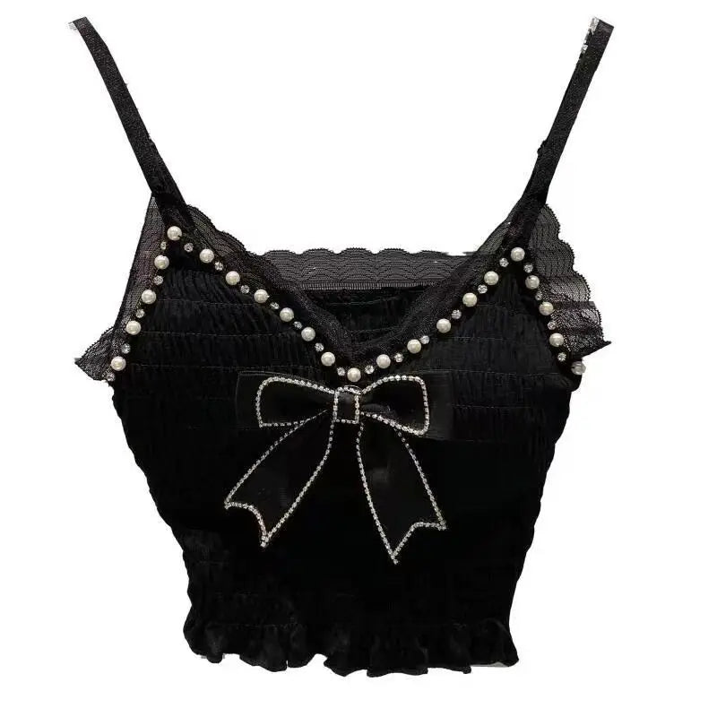 Summer Lace Bow Camisole for Women Pleated Crop Tops Vintage Clothes Harajuku Solid Sexy Ladies Sweet Elegant Camisole