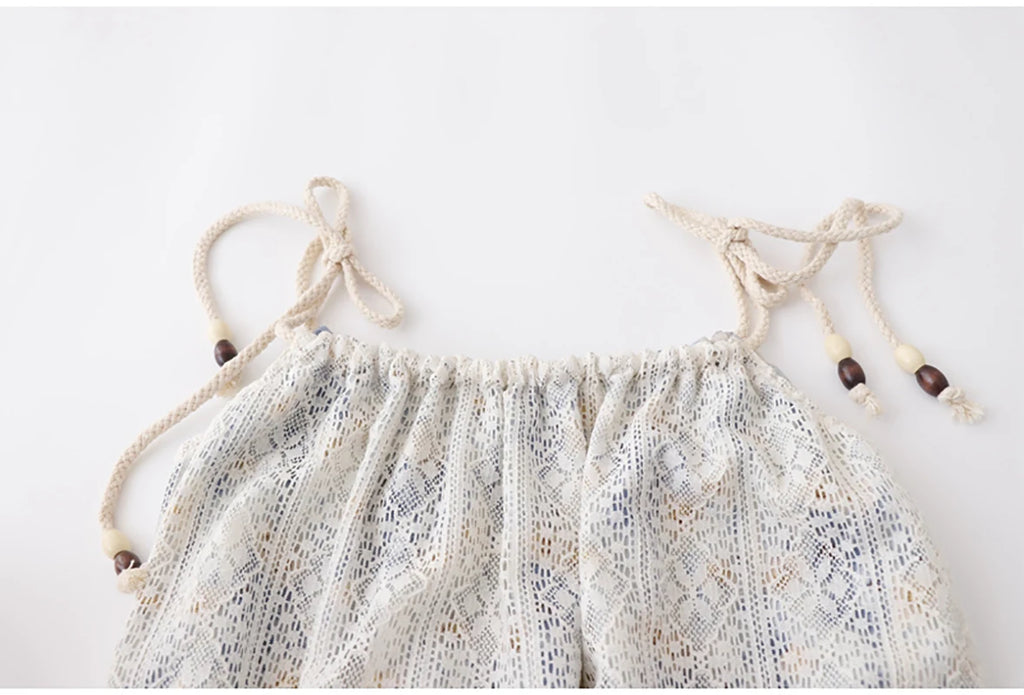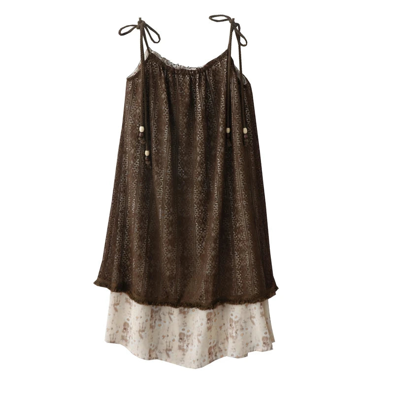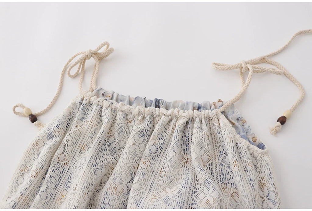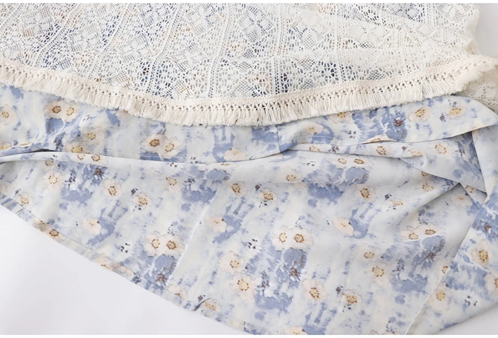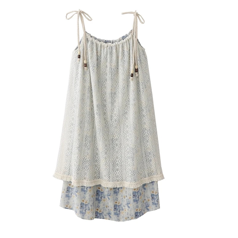 Summer New French Style Seaside Vacation Slip Dress Lace Tassels Flower Mid Long Layered Skirt Sweet Fake Two Pieces Beach Dress