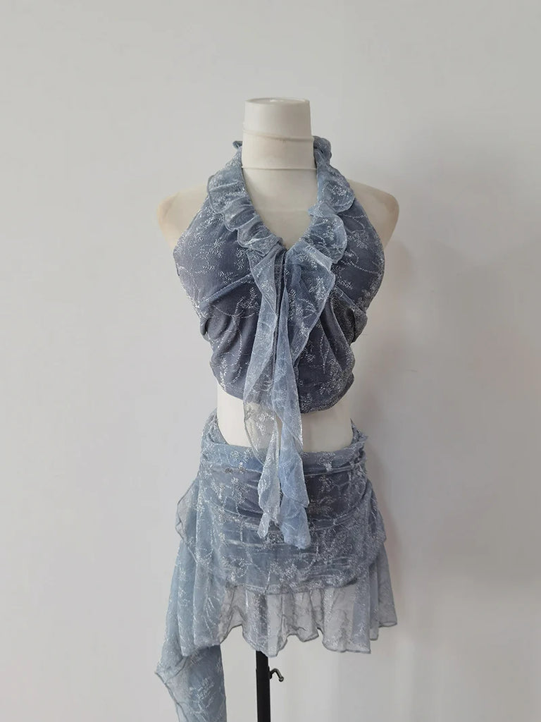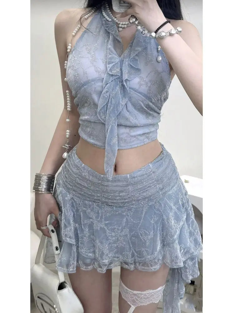 Sweet Hot Girl Sexy Suit Women's Summer Ruffle Edge Halter Neck Top Irregular Short Skirt Two-piece Set Fashion Female Clothes