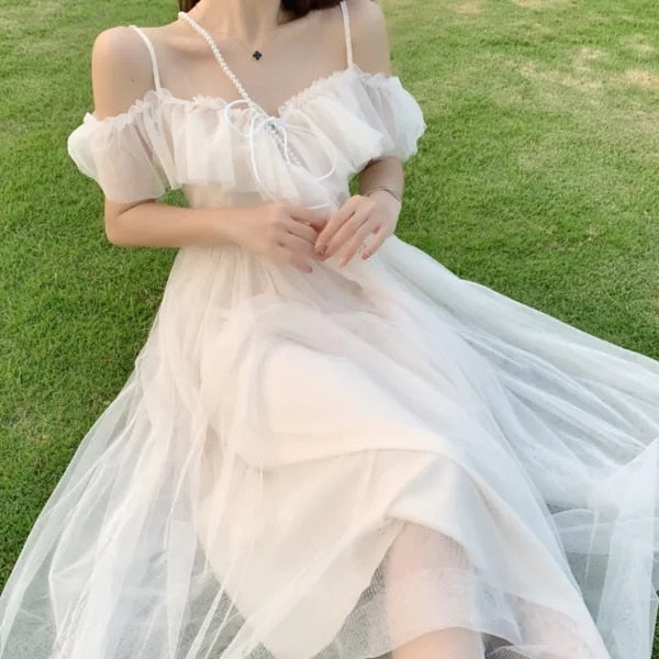 Sweet Kawaii Fairy Princess Mesh Dress Elegant White Spaghetti Strap Off Shoulder Party Dresses Woman Vacation