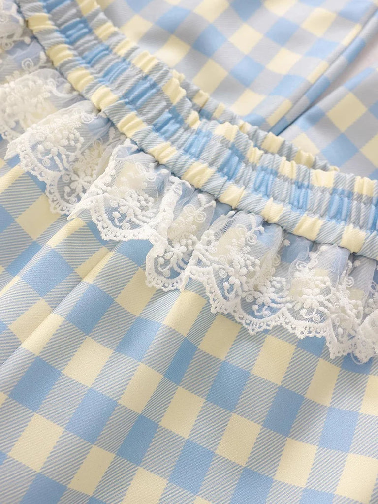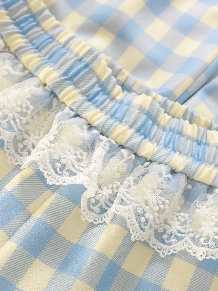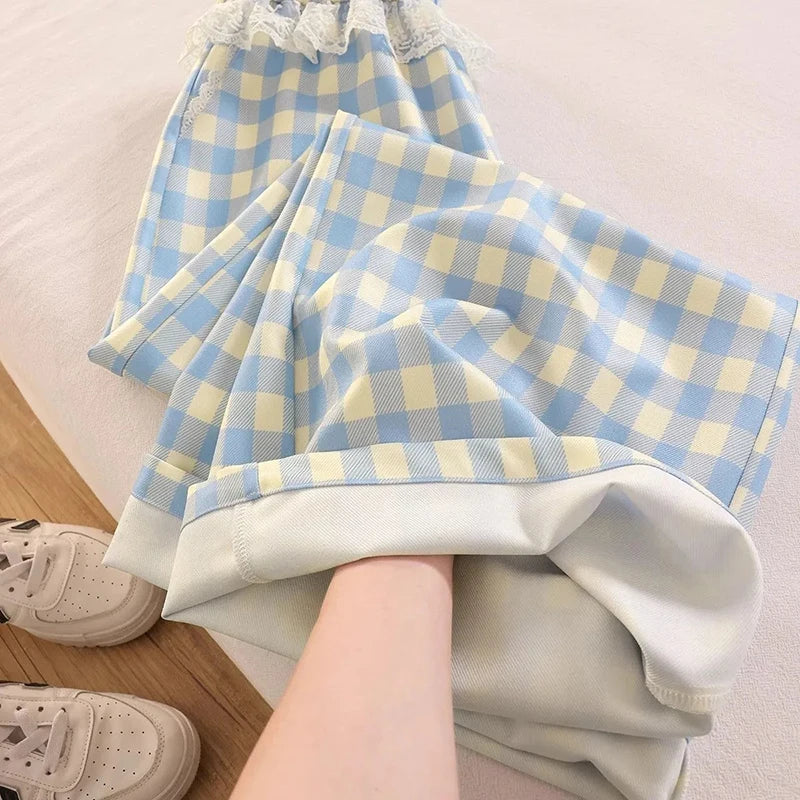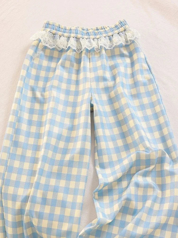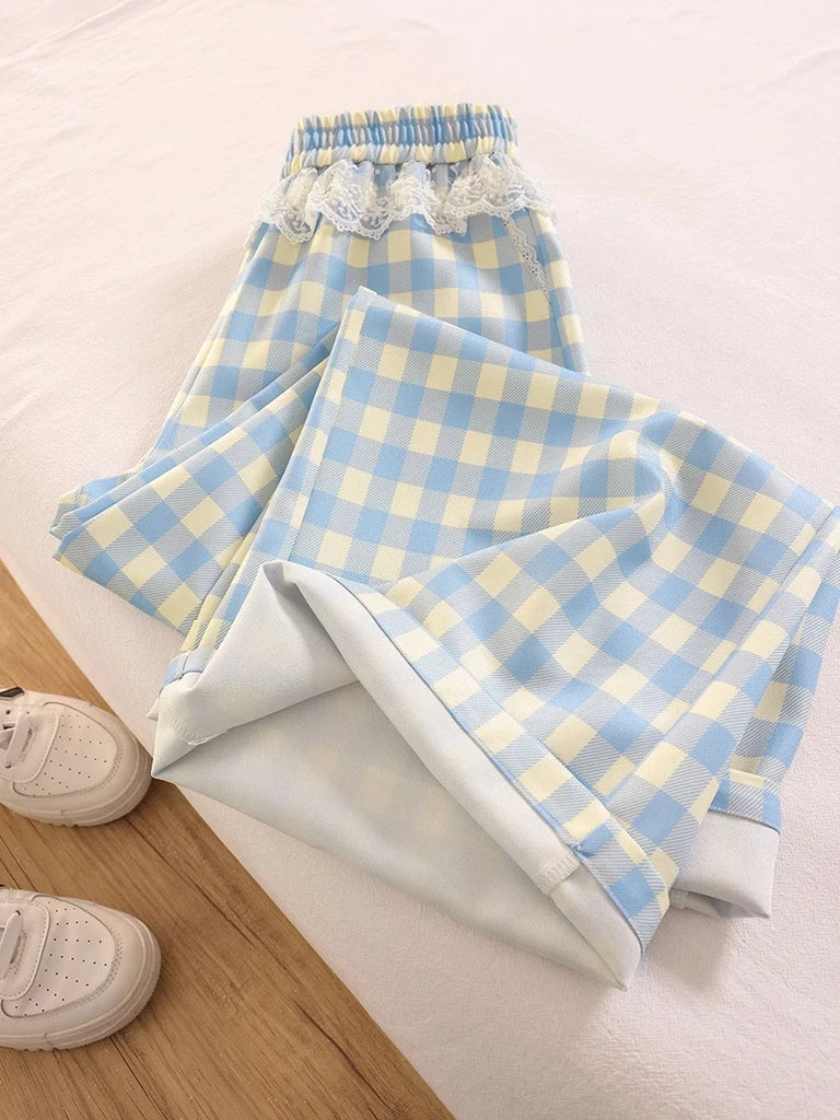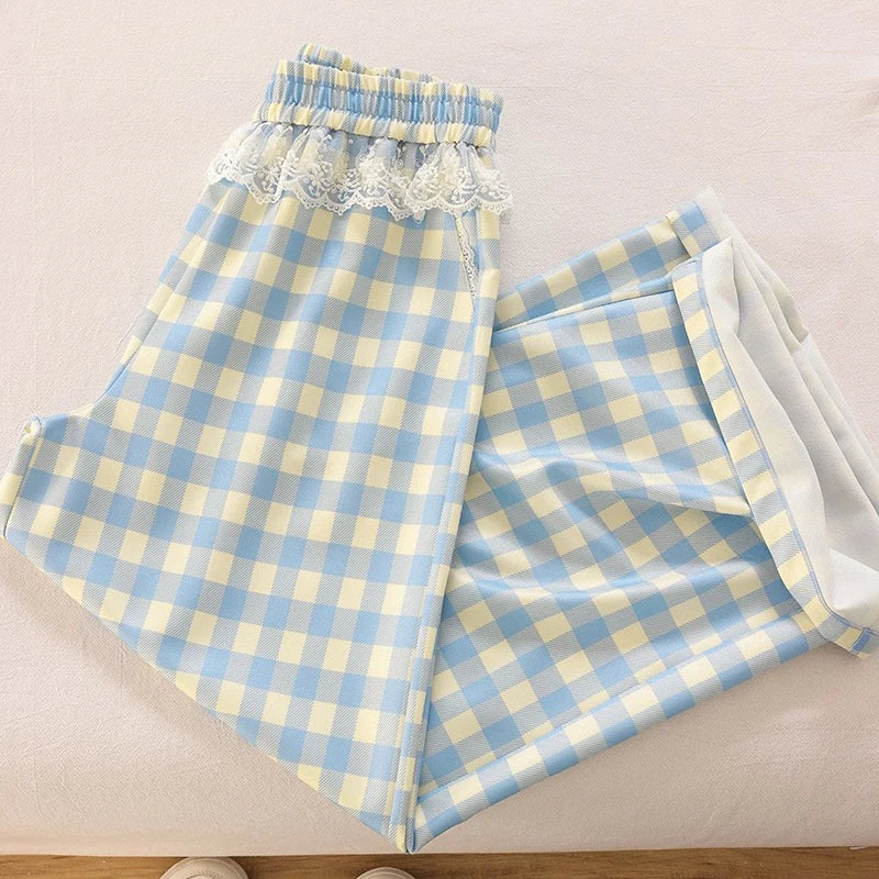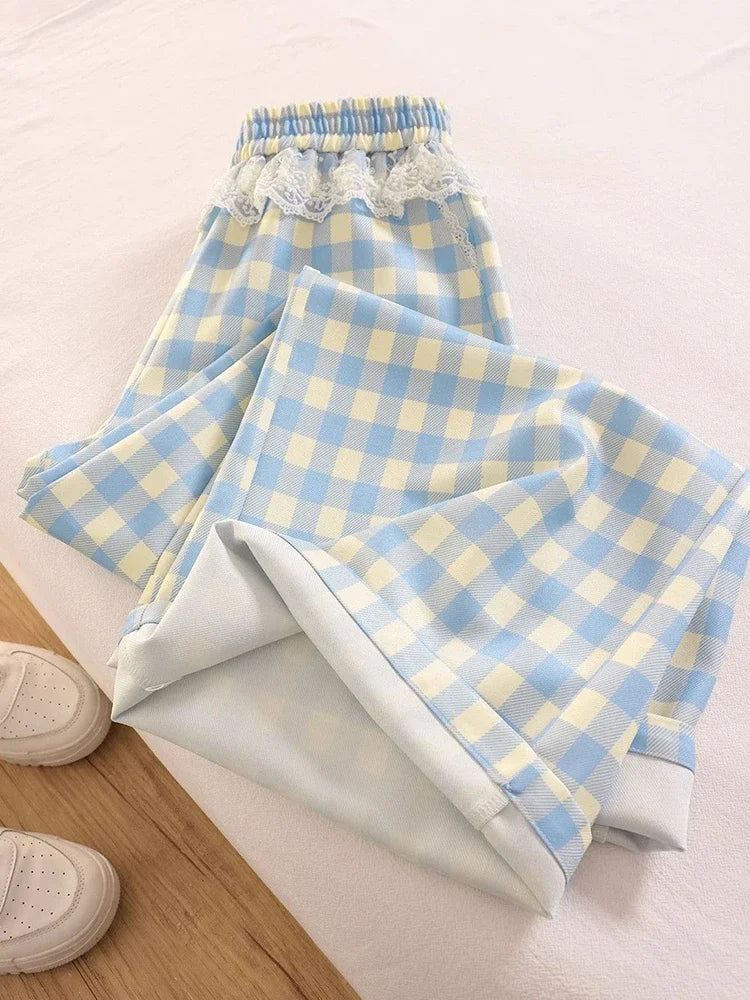 Sweet Lace Plaid Pants Women Patchwork Loose High Waist Wide Leg Trousers Japan Casual Lady Vintage Cute Spring New Pant