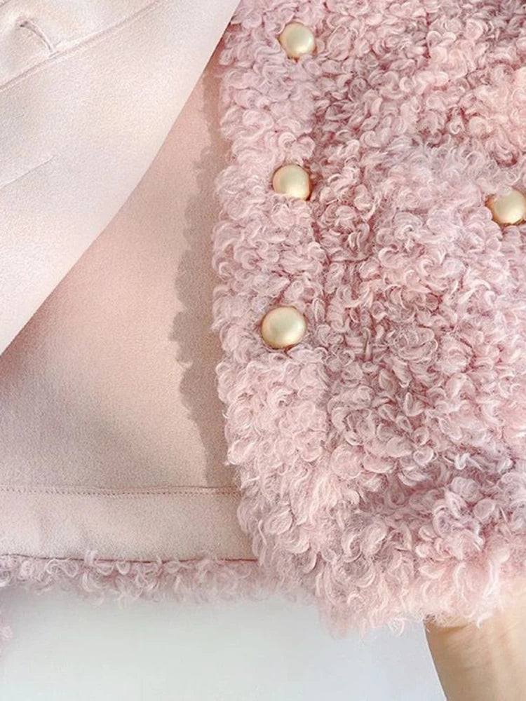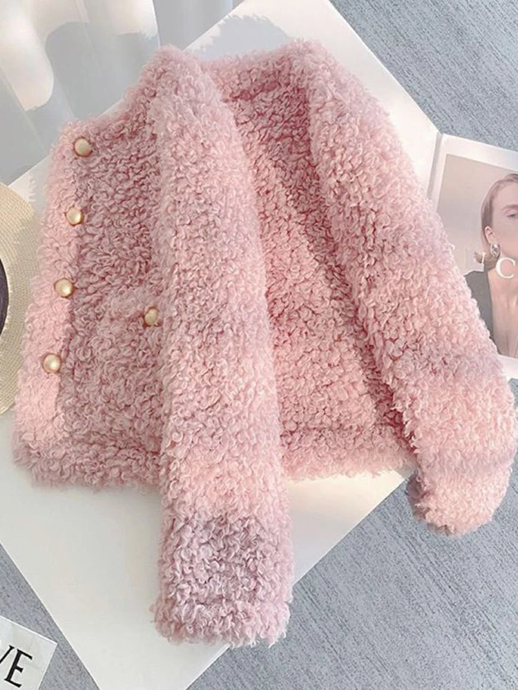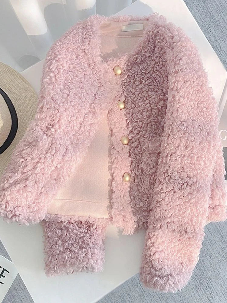 Sweet Pink Faux Lamb Coat Women Cute Slim Long Sleeve Vintage Jacket Winter Warm O Neck Elegant Korean Female Casual Tops